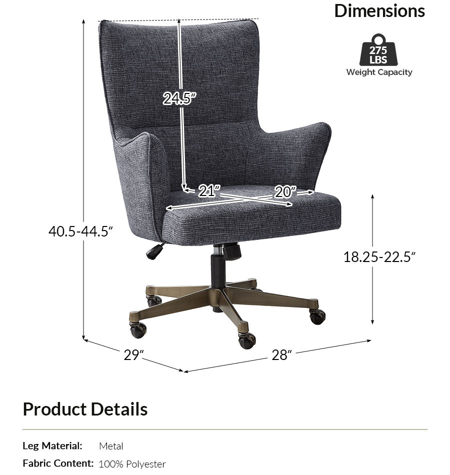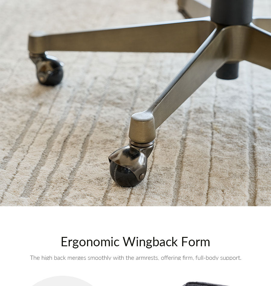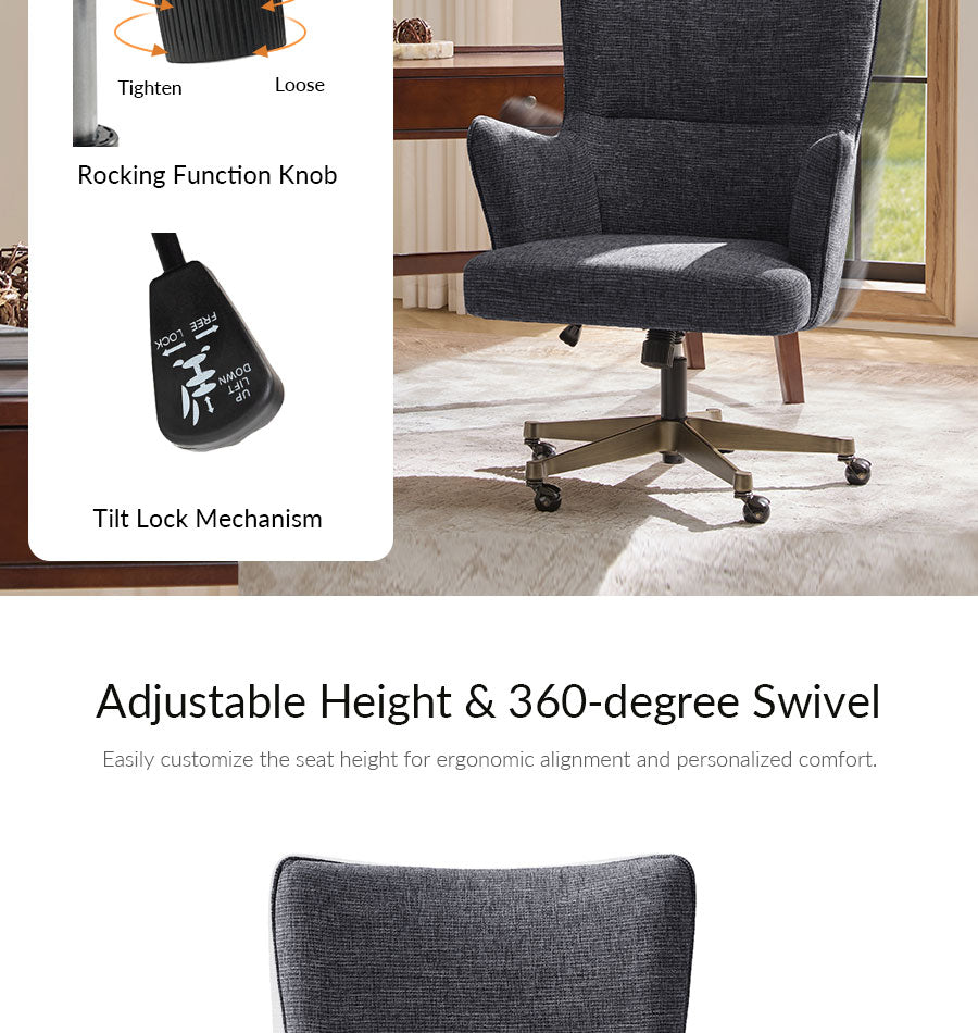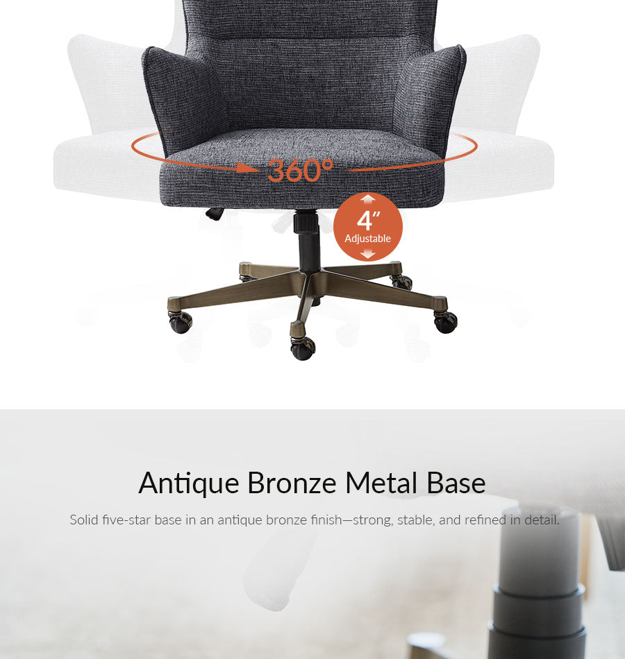 The antique bronze base anchors the design with elegance while providing durable strength, and smooth-rolling casters allow effortless mobility across your workspace. Adjustable seat height and a tilt-lock feature let you find your perfect ergonomic position for sitting, leaning, or relaxing. Whether used as a home office chair, task chair, or reading chair, this wingback chair delivers support, style, and refined comfort in one functional, visually striking design.