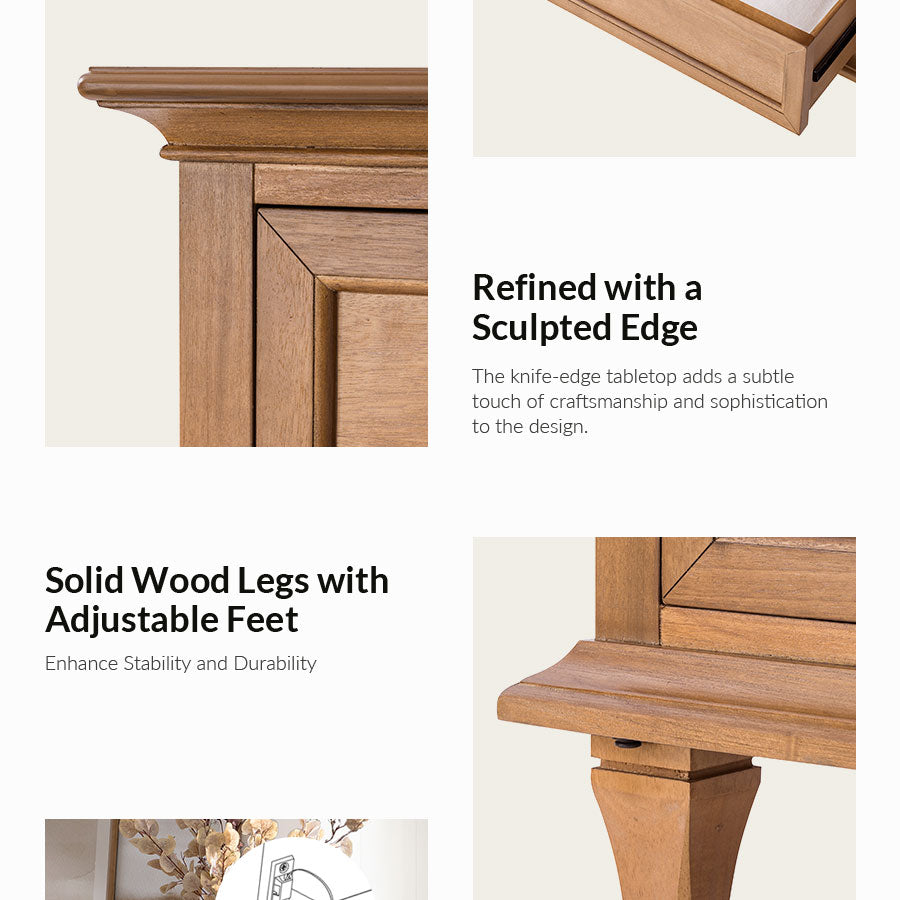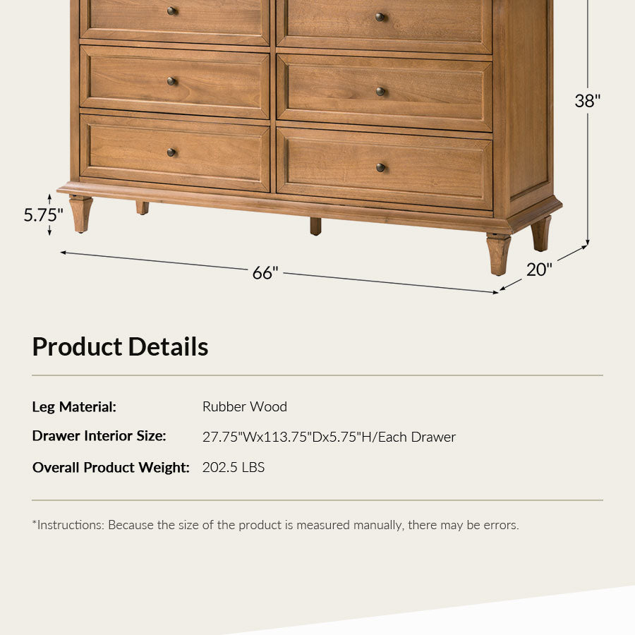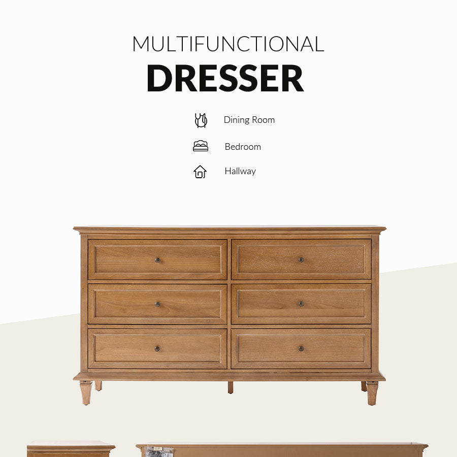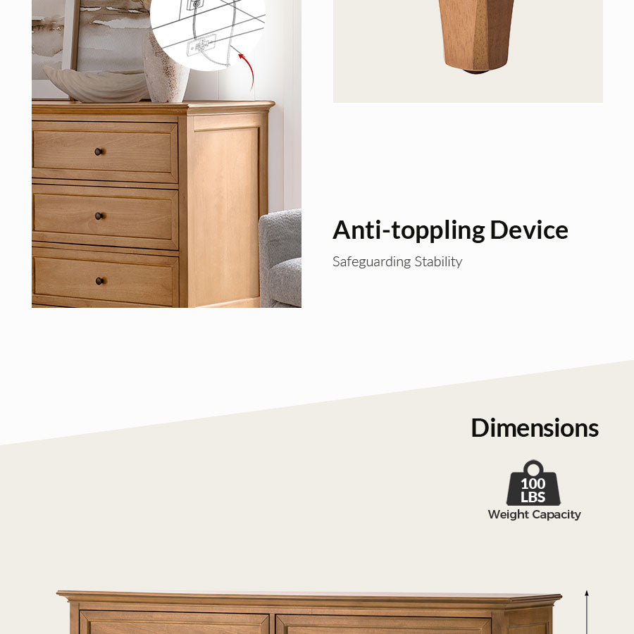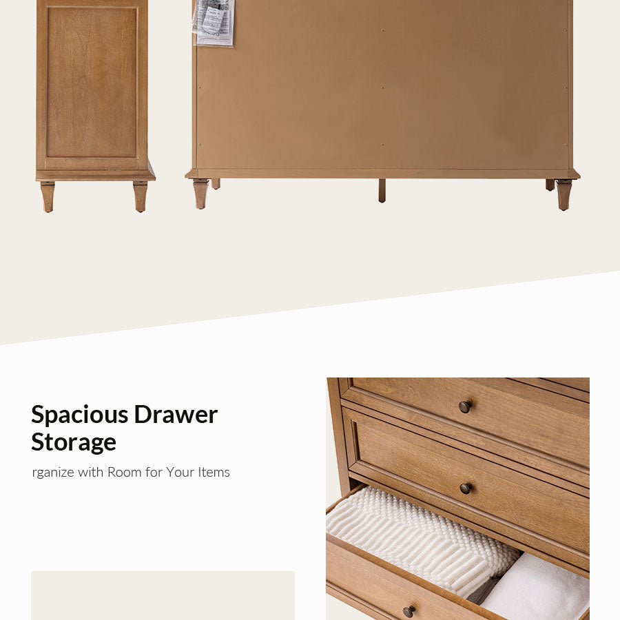 - Product Including:One Dresser,simple assembly requires only leg. - Divided Top Drawers:First-row drawers feature built-in dividers for organized storage of smaller items. - Knife-Edge Top Panel:The sleek beveled top adds a touch of sophistication to the design. - Transitional Style:Clean lines and a refined silhouette blend seamlessly with both modern and classic interiors. - Spacious Storage:Large lower drawers provide ample space for clothing, linens, and accessories. - Solid Wood Legs:Durable solid wood legs ensure stability