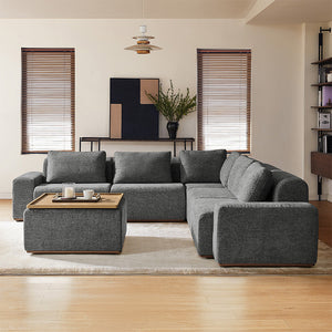 A refined living space that exudes understated elegance—anchored by a cloud-inspired modular sofa in supple genuine leather, complemented by a sculptural mid-century modern swivel chair, and enriched with modern farmhouse touches for a harmonious blend of luxury and warmth.
