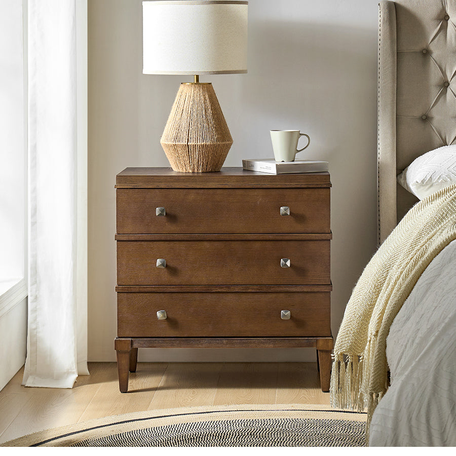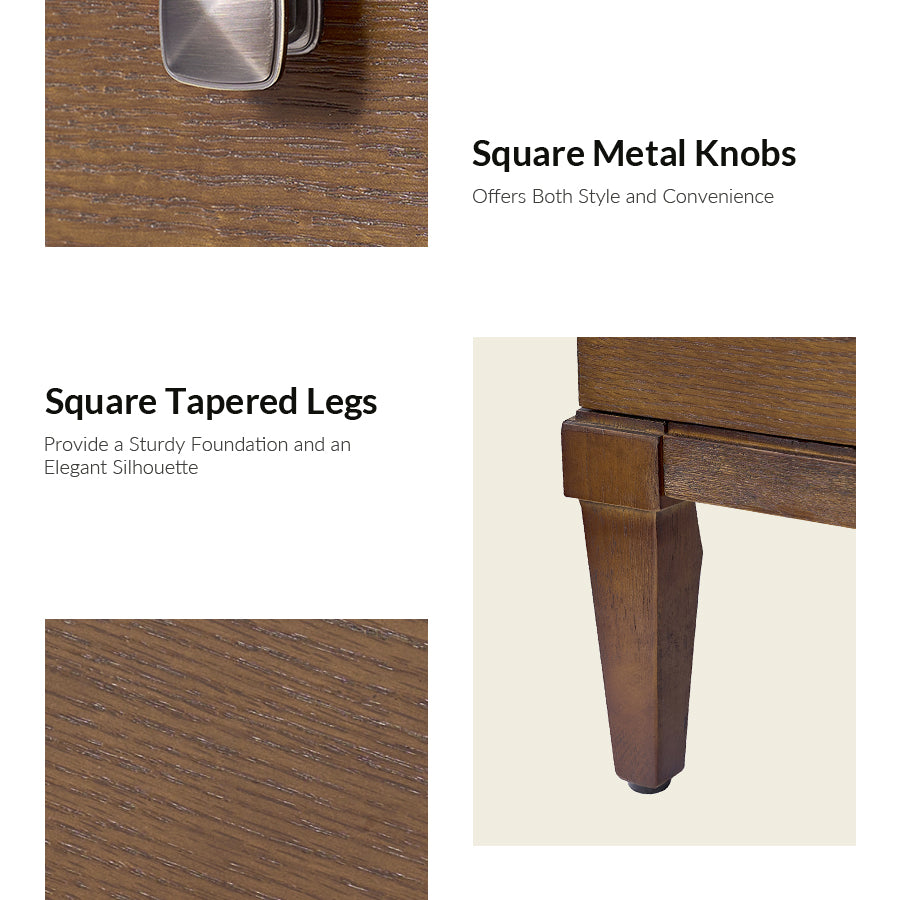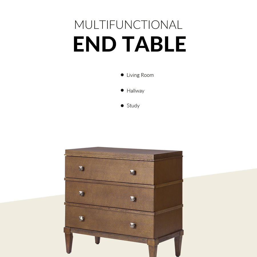 This transitional end table combines modern functionality with classic design elements. Featuring a sleek square metal knob that adds a contemporary touch, it offers both style and convenience. The end table is with square tapered legs, providing a sturdy foundation and an elegant silhouette. Three spacious drawers offer ample storage, while the top drawer is equipped with a hidden charging station at the back, making it easy to keep your devices powered without clutter. This versatile end table is suitable for living spaces, offering a blend of timeless design and modern convenience that suits a wide range of decor styles. Its thoughtful design ensures both practicality and a refined aesthetic for your home.