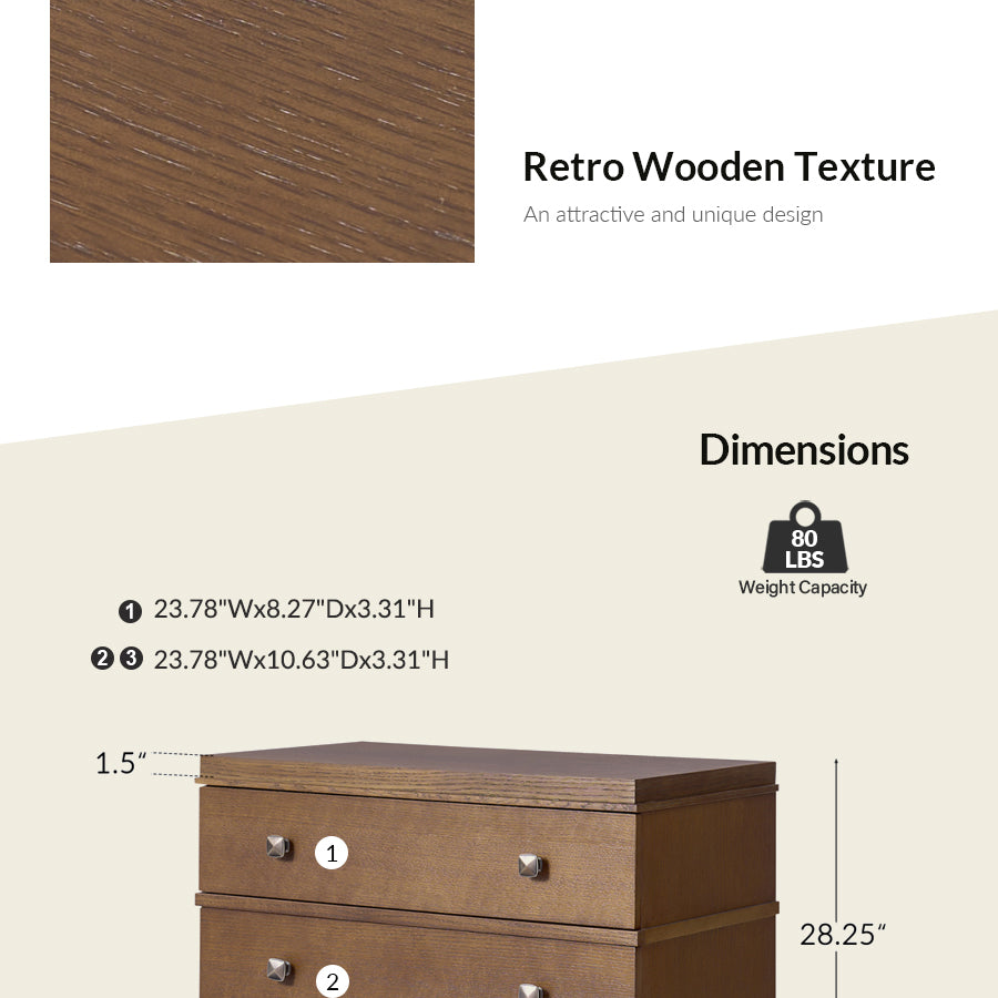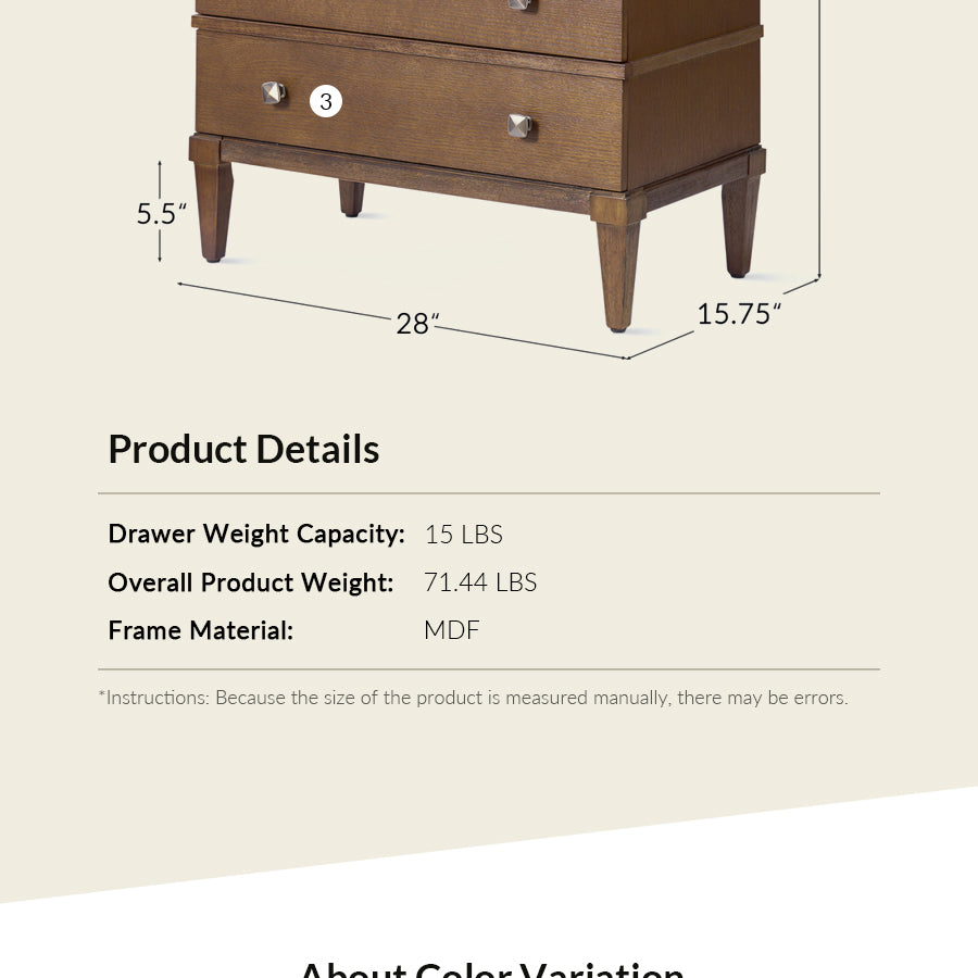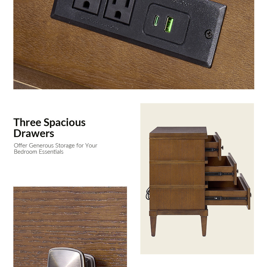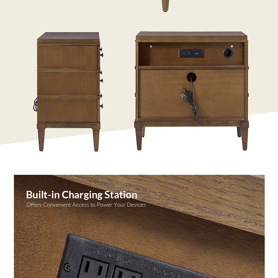 - Product Including: Set of 1 & Set of 2 End Table, assembly is required.With Distressed Finish. - Top Drawer with Charging Station: The top drawer features a concealed charging station at the back, allowing you to neatly charge phones, tablets, or other devices without tangled cords cluttering the space. - Solid Wood Legs: With sturdy solid wood legs, the end table boasts square tapered legs that not only add stability but also lend a timeless, tapered silhouette for added sophistication. - Square Metal Konbs: The sleek, square-shaped metal knobs provide a minimalist, refined look, enhancing the elegant aesthetic while offering easy drawer access. - Three Spacious Drawers: Designed with functionality in mind, the end table includes three deep drawers that offer generous storage for your living room essentials, from books and gadgets to clothing and accessories. - Smooth Glide Drawers: The drawers are equipped with smooth glide mechanisms, ensuring quiet, effortless opening and closing for daily use.