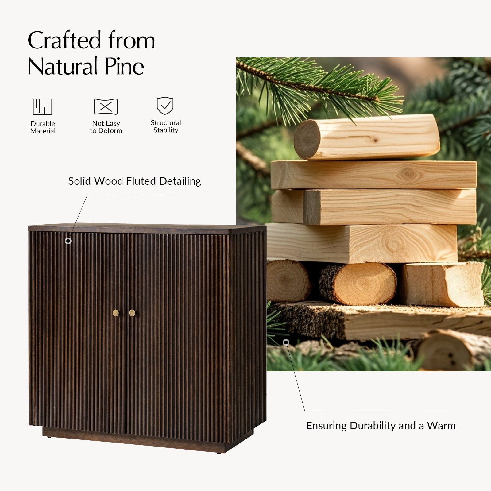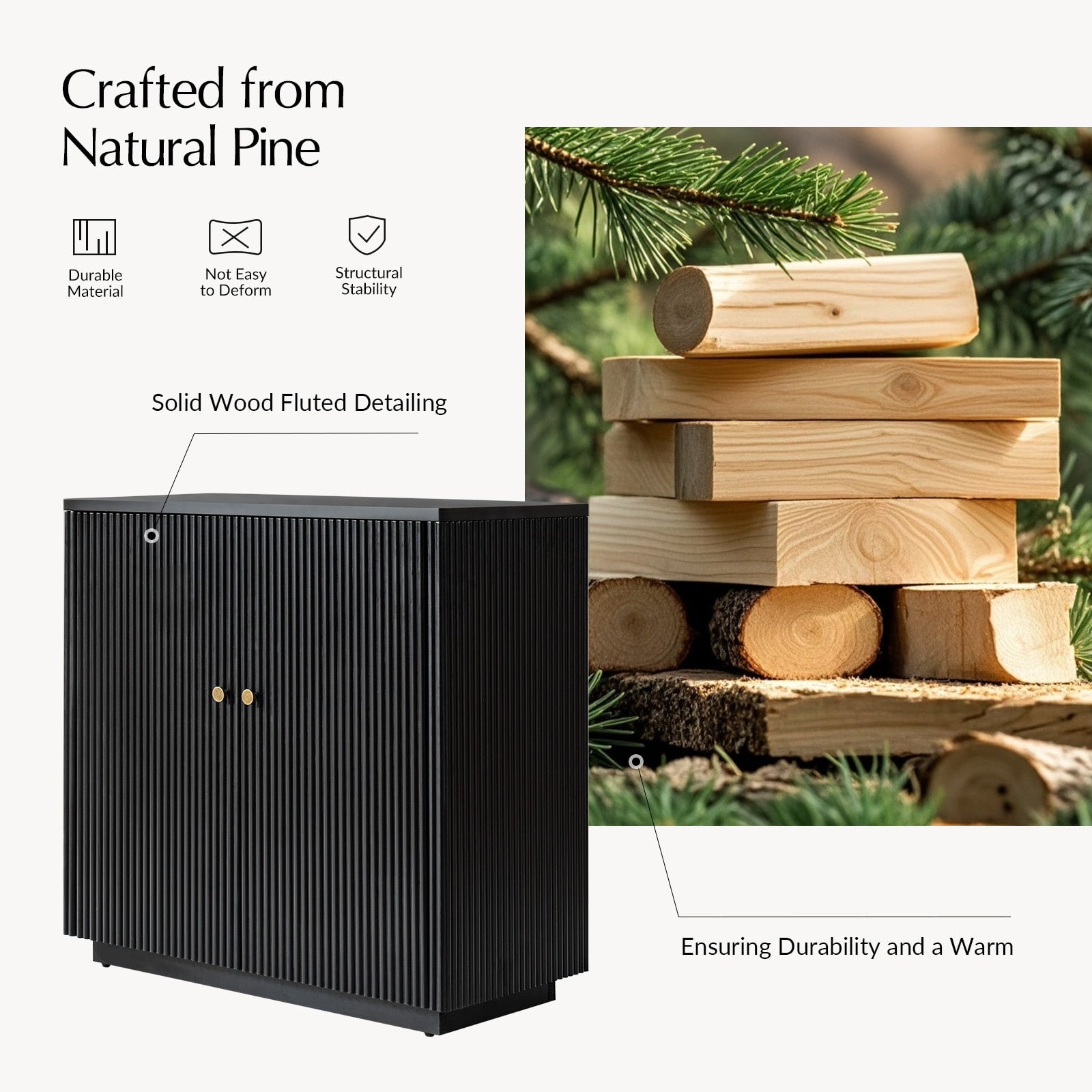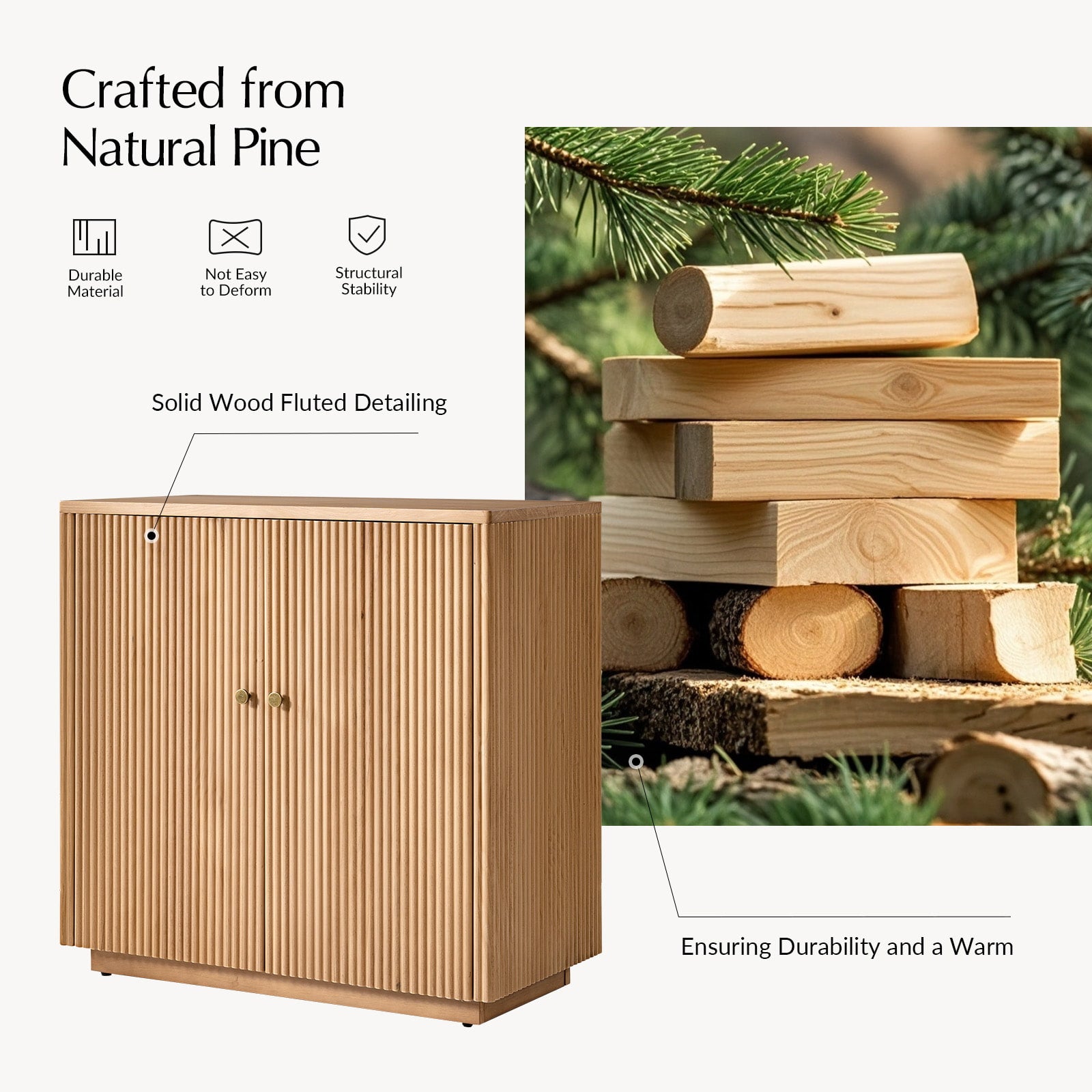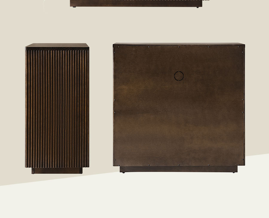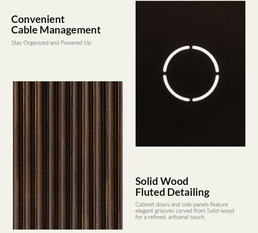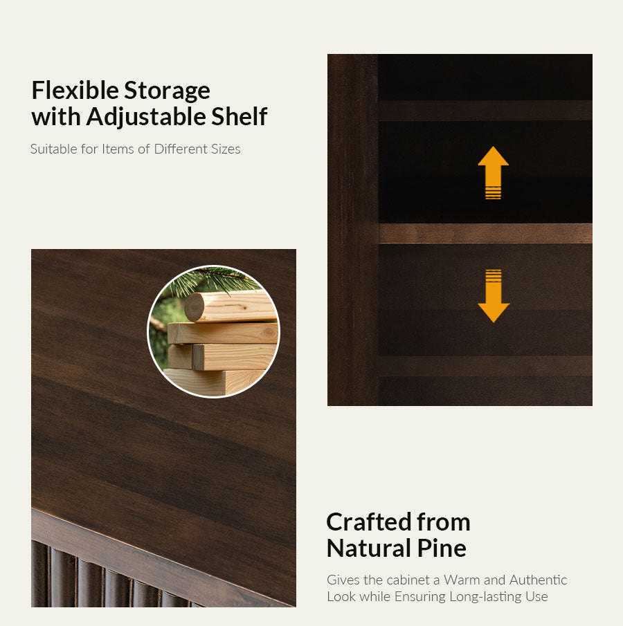 - Product Including:Set of 1 & Set of 2 cabinet,assembly is required. - Built-In Cable Management:Keeps wires organized and out of sight for a clean, clutter-free look. - Solid Pine Wood Construction:Made from natural pine wood, ensuring durability and a warm, organic aesthetic. - Round Fluting Detail:Elegant round grooves on cabinet doors and side panels add handcrafted texture and style. - Adjustable Shelf:Customizable interior storage to fit your varying needs. - Versatile Use:Perfect for living rooms, bedrooms, or home offices, combining function and timeless design.