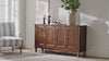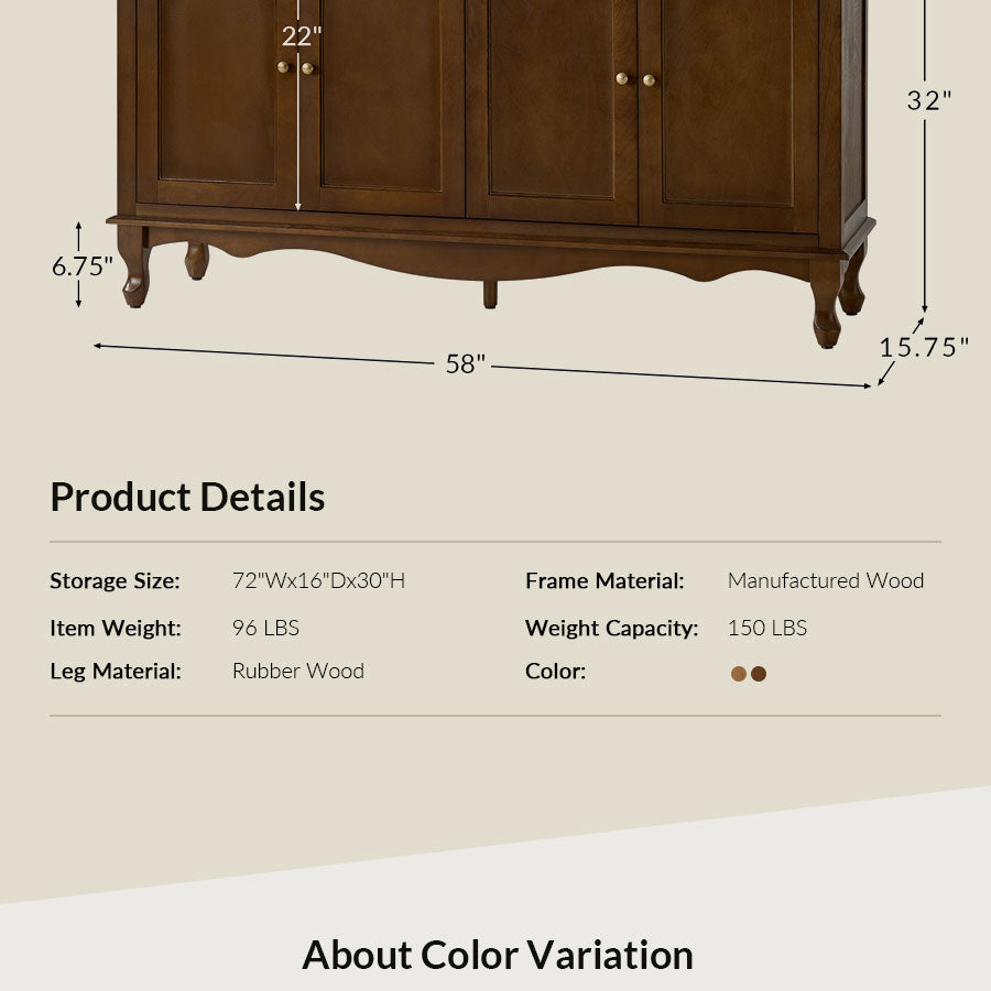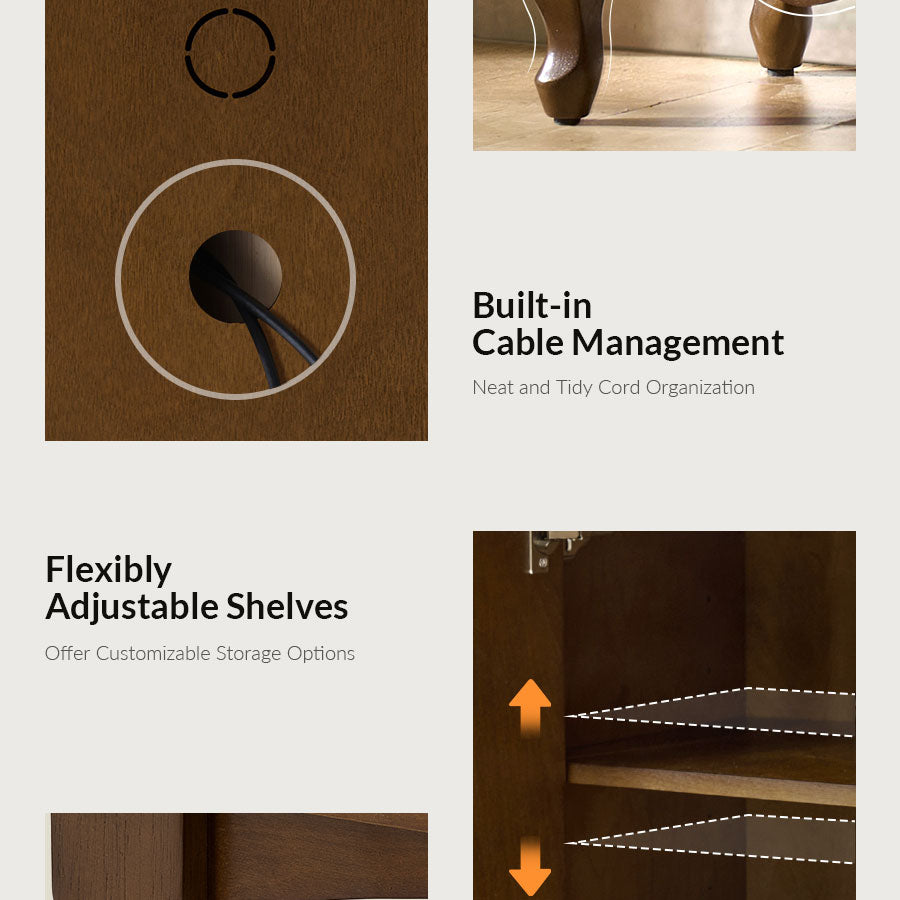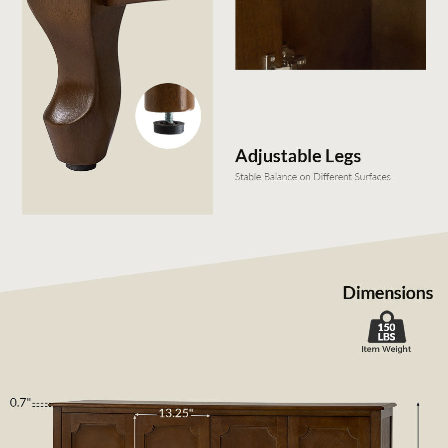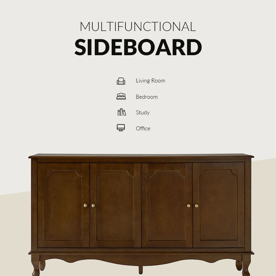 The French country-inspired sideboard features classic details such as turned legs and a gracefully shaped apron that echo vintage European design. The soft, neutral finish enhances the warm, welcoming character, making it a fit for both formal dining rooms and casual living spaces. Designed with versatility in mind, this four-door sideboard offers spacious interior storage with adjustable shelves, allowing you to accommodate items of varying sizes—from tableware and serveware to board games and decorative pieces. Adjustable legs provide added stability, even on uneven floors, while the integrated cable management keeps cords organized and out of sight, making this piece ideal for use as a media console or entertainment unit as well. Whether placed in your dining area, living room, or hallway, it adds a refined yet relaxed aesthetic while offering practical storage. With its combination of French countryside styling and transitional design, it delivers both beauty and utility, making it an addition to any transitional interior.
