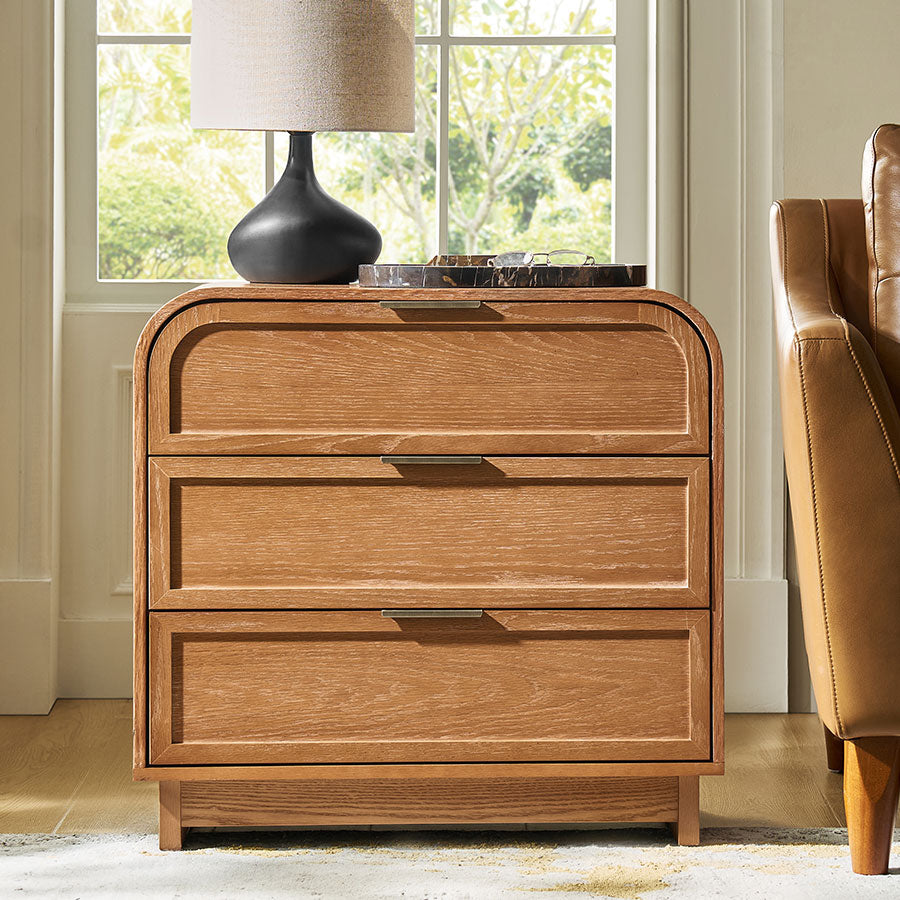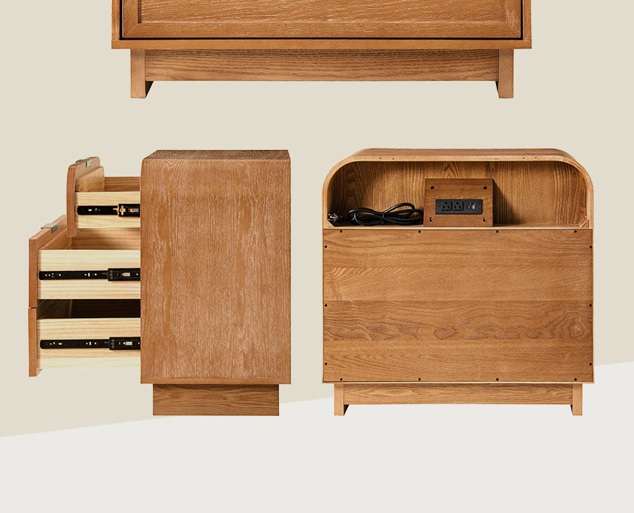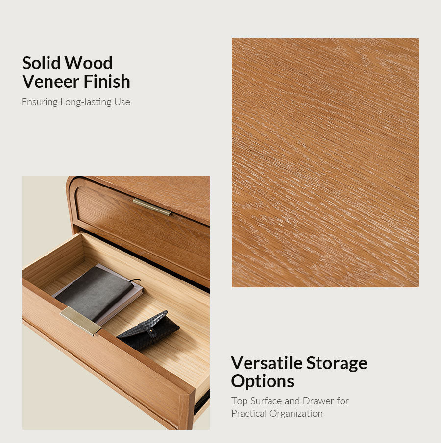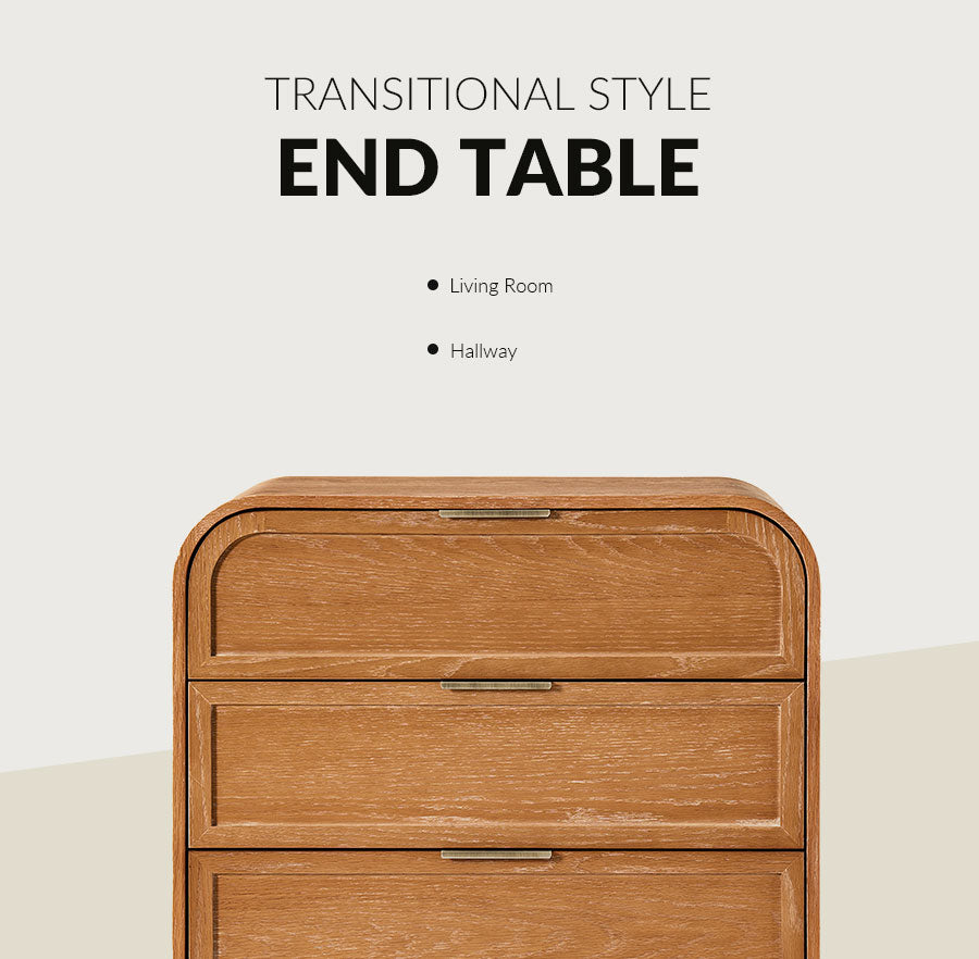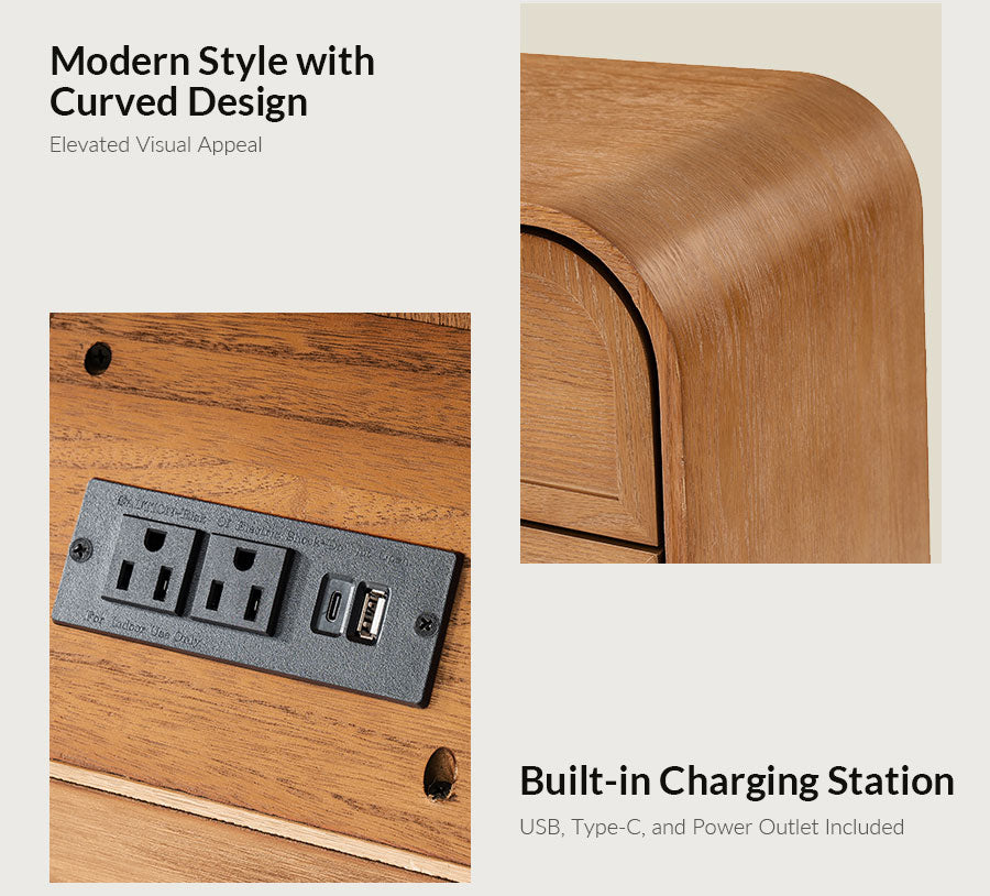 Bring both style and function to your living room with this modern end table. Featuring a beautifully arched tabletop and elegant curved design, it adds a soft, sophisticated touch to any space. The solid wood veneer finish and sturdy solid wood legs offer lasting durability and a high-end look. Three spacious drawers provide ample storage for bedside essentials, while the built-in charging station with USB ports keeps your devices powered and within reach. Easy to assemble, this end table requires only the legs to be attached, making setup quick and hassle-free. A perfect blend of convenience, craftsmanship, and contemporary design.