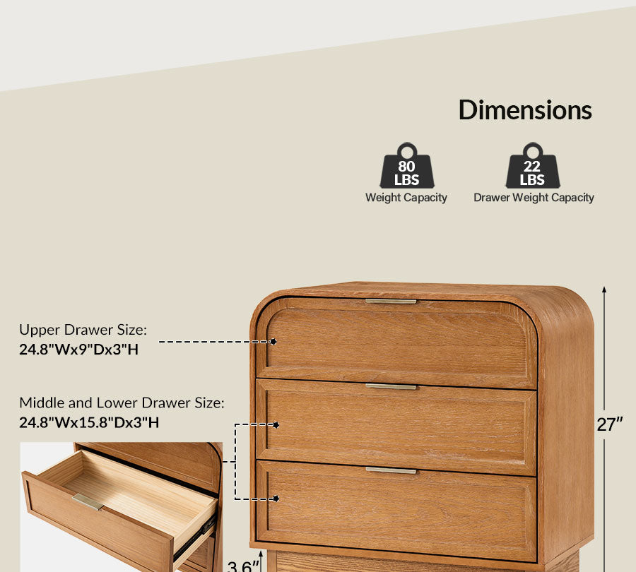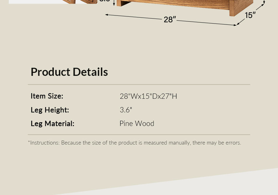 Product Details: Weight Capacity: 80 LBS Drawer Weight Capacity: 22 LBS Assembly Required: Yes Weights & Dimensions Item Size:28"Wx15"Dx27"H Item Weight: 65 LBS Instructions: Because the size of the product is measured manually, there may be errors.