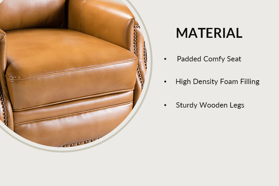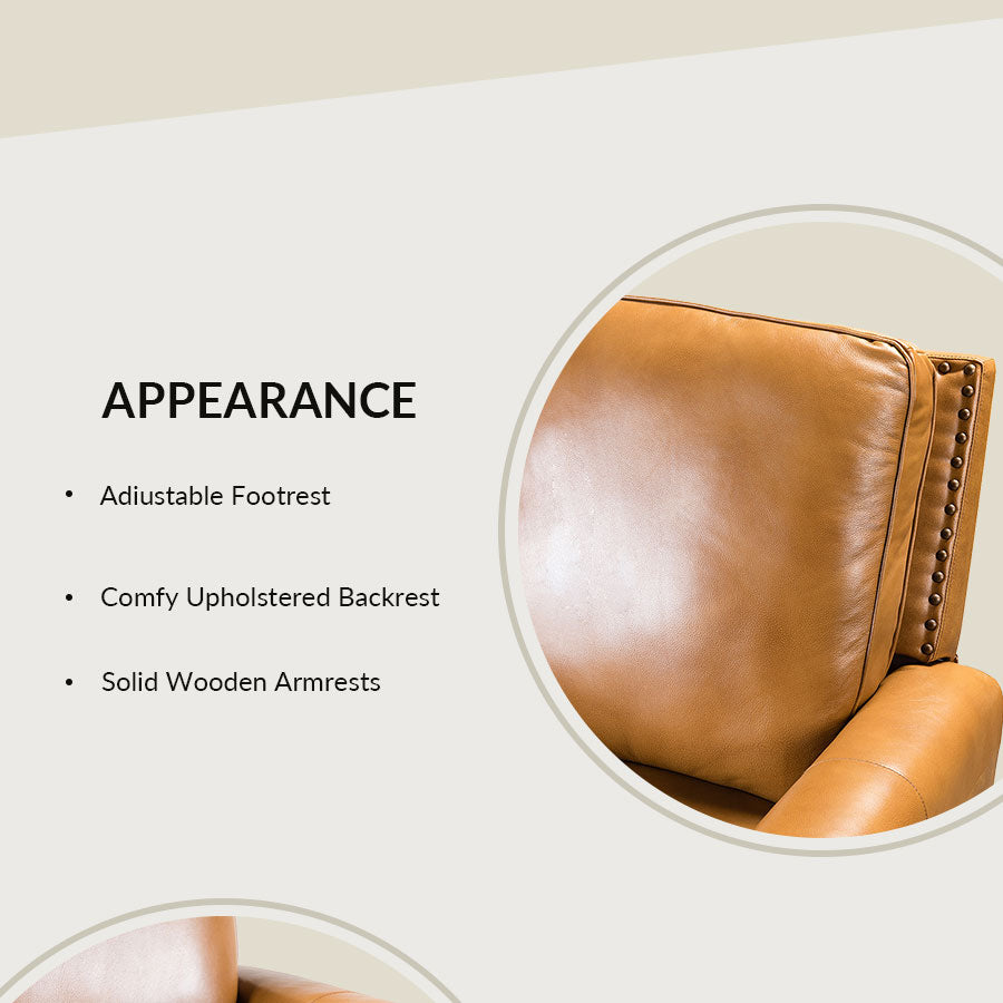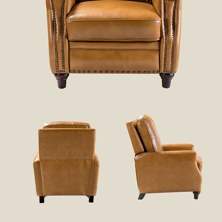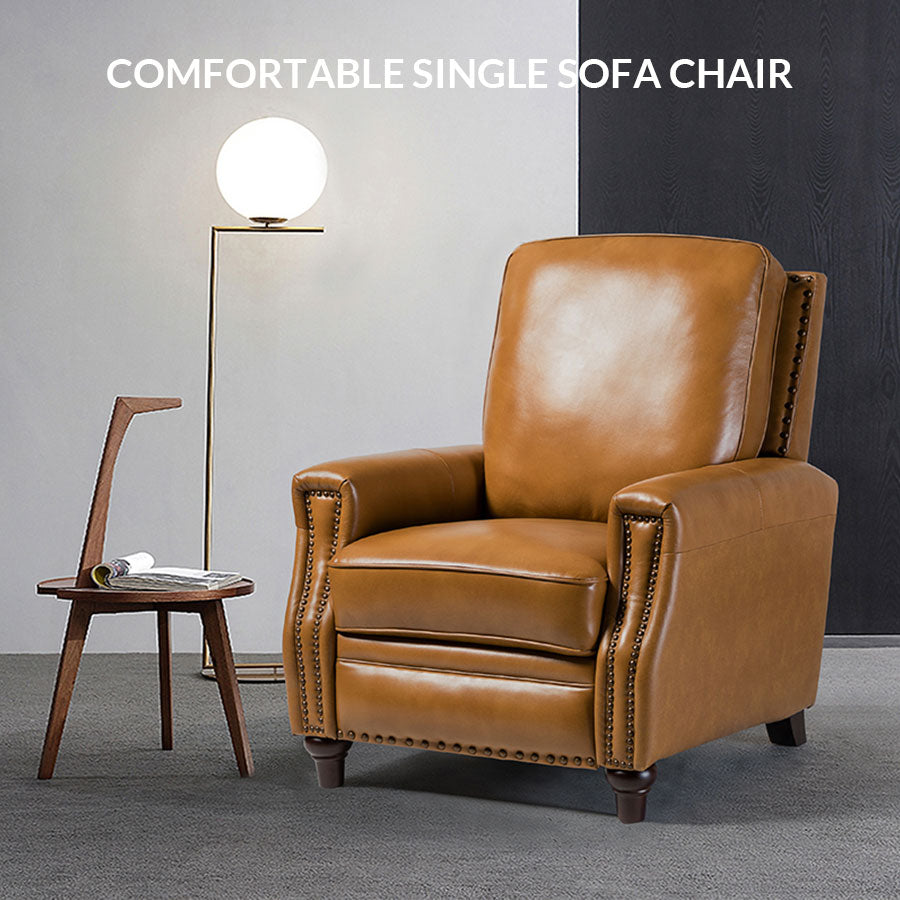 - Product Including: One genuine leather cigar recliner, assembly required. - Mid Century Modern Style: Upholstered in foam and genuine Top-layer leather, the chair sports nailhead trim for an inviting feel, suitable for all kinds of living room decoration. - Material: Sturdy wooden frames and armrests, high-density foam filling with padded pocket spring. - Features: The backrest can be tilted from 108 to 140 degrees. Cooperating with the footrest, it is comfortable to sit and watch TV or lie down and rest. Perfect for the living room, bedroom, or home theater. Enjoy your leisure time. - Safety Reminder: Due to the design of the process, all recliners will have a small gap between the left and right sides of the back and the seat cushion. For safety reasons, please pay special attention to the use of children at home to prevent pinching.