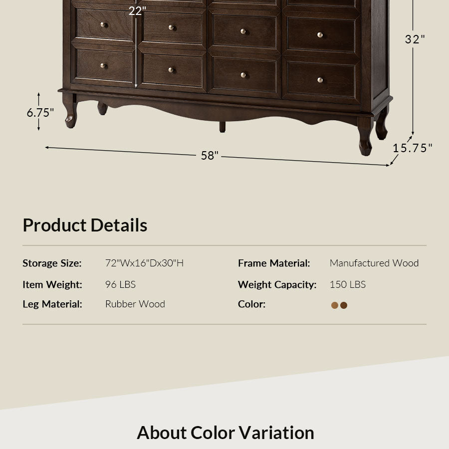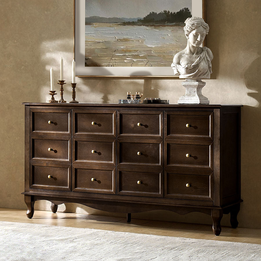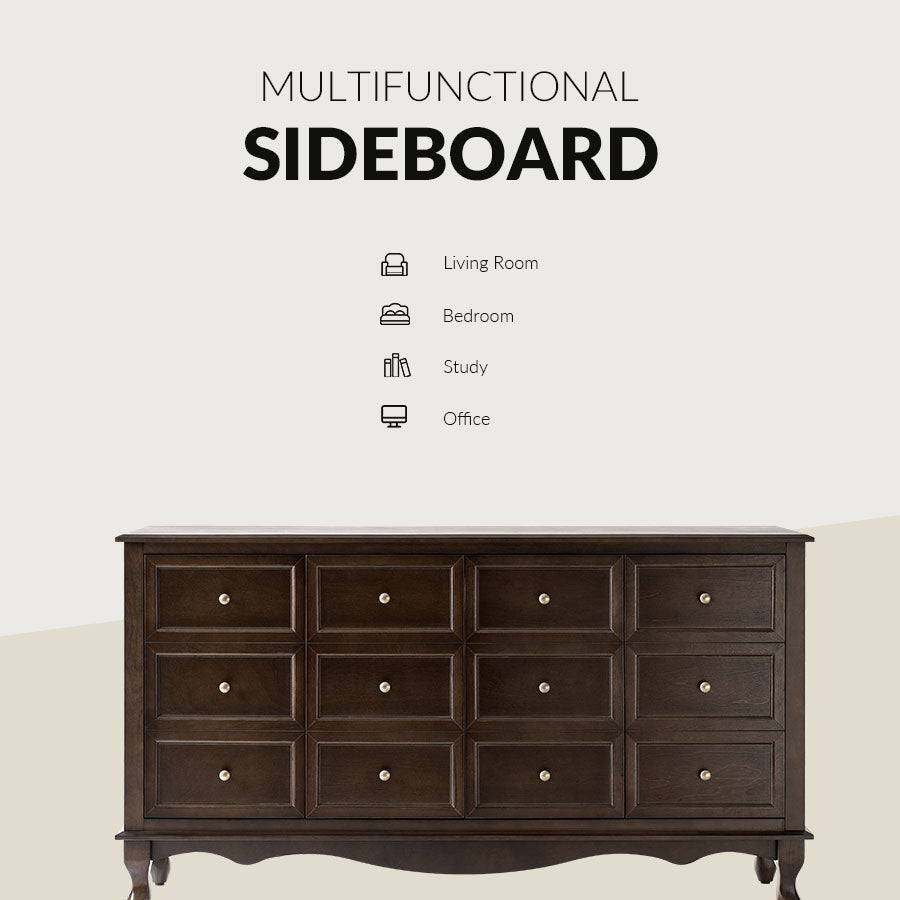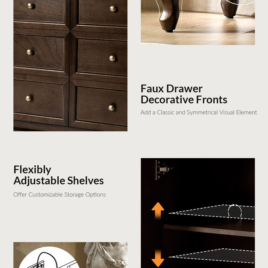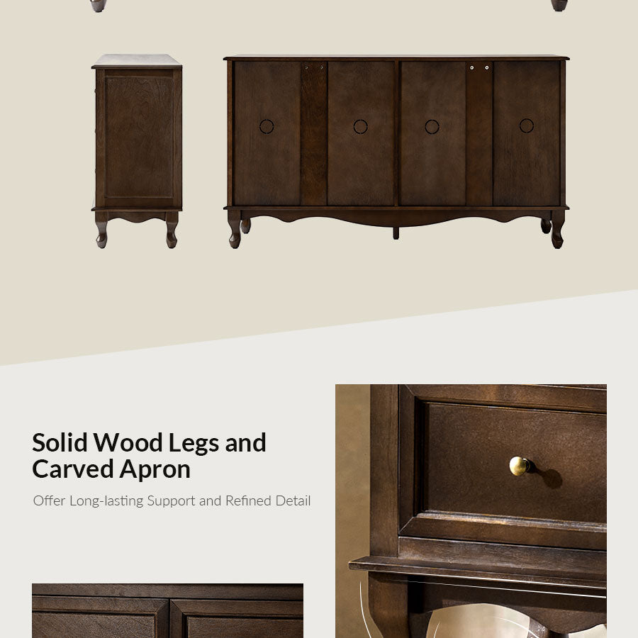 - Product Including: One sideboard, assembly is required. - Faux Drawer Decorative Fronts: Cleverly designed to mimic the look of twelve individual drawers, the sideboard actually features four large doors, combining aesthetic charm with practical storage. The multi-panel illusion adds a classic and symmetrical visual element that enhances any room. - Spacious Four-door Storage Cabinet: Behind the decorative fronts are four generously sized cabinet doors, offering ample hidden storage for household items, dinnerware, or linens, making it suitable for living rooms, dining rooms, or entryways. - Solid Wood Legs and Carved Apron: Crafted with sturdy solid wood legs and an elegantly curved apron, this piece offers long-lasting support and refined detail. The shaped base adds a touch of classic craftsmanship and enhances the overall structure’s visual weight and stability. - Solid Wood Veneer Finish: The sideboard is wrapped in a rich, warm-toned wood veneer, showcasing natural grain patterns that elevate its traditional appeal while offering a smooth, durable surface resistant to everyday wear. - Adjustable Shelves: Inside the sideboard, adjustable shelves provide customizable storage options, allowing you to adapt the interior to fit various item sizes and improve organization.