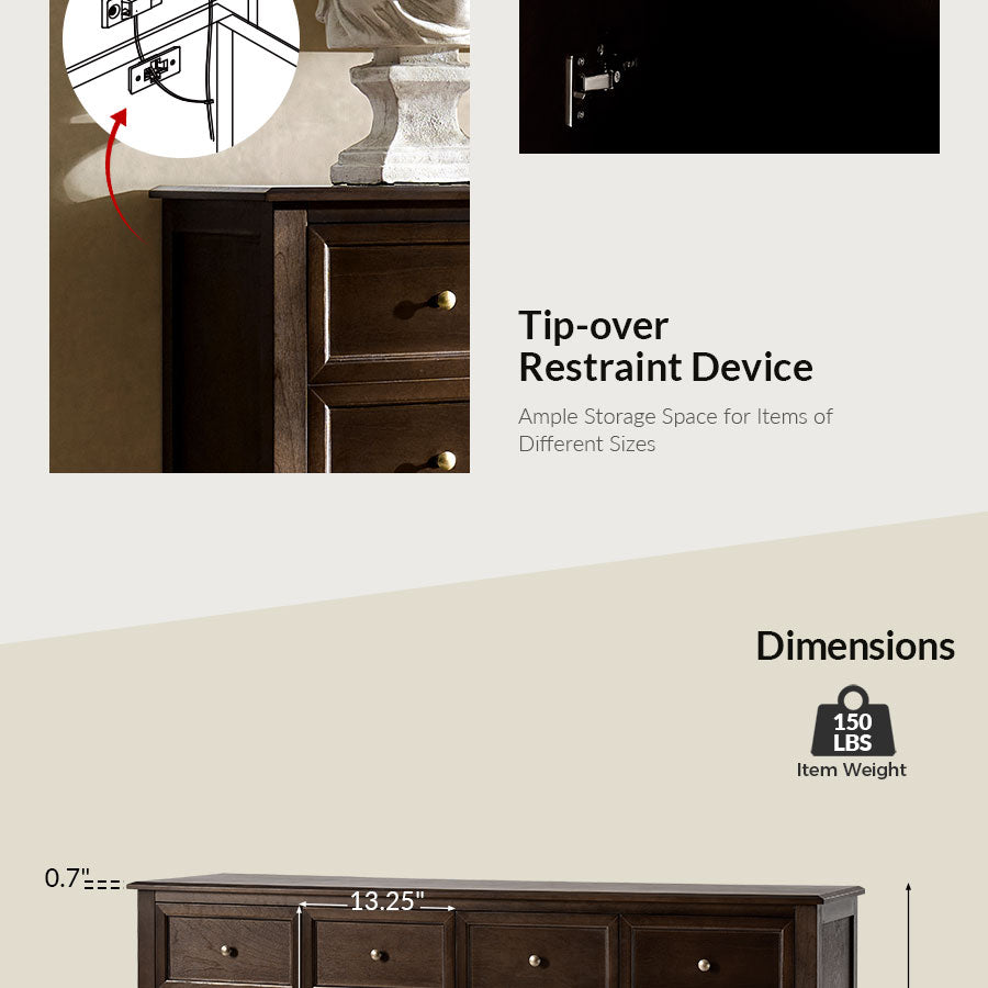 A built-in tip-over restraint device adds the perfect safety touch, making it a worry-free choice for homes with kids or pets. Antique-finished metal knobs adorn the doors, providing a tactile, vintage-inspired feel that enhances its rustic elegance. Balancing aesthetic sophistication with functional versatility, this sideboard is a thoughtful addition for those who value both enduring style and everyday practicality.