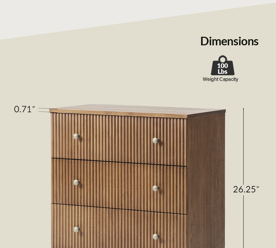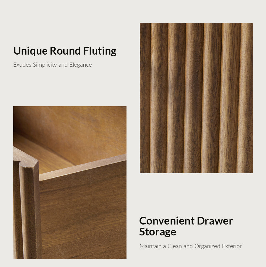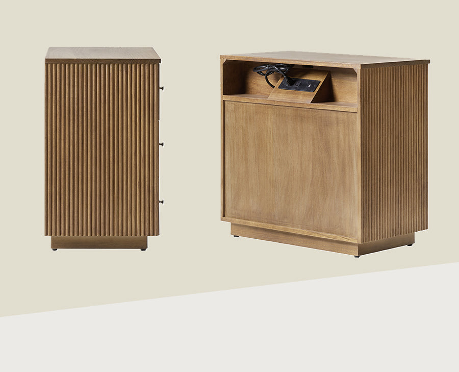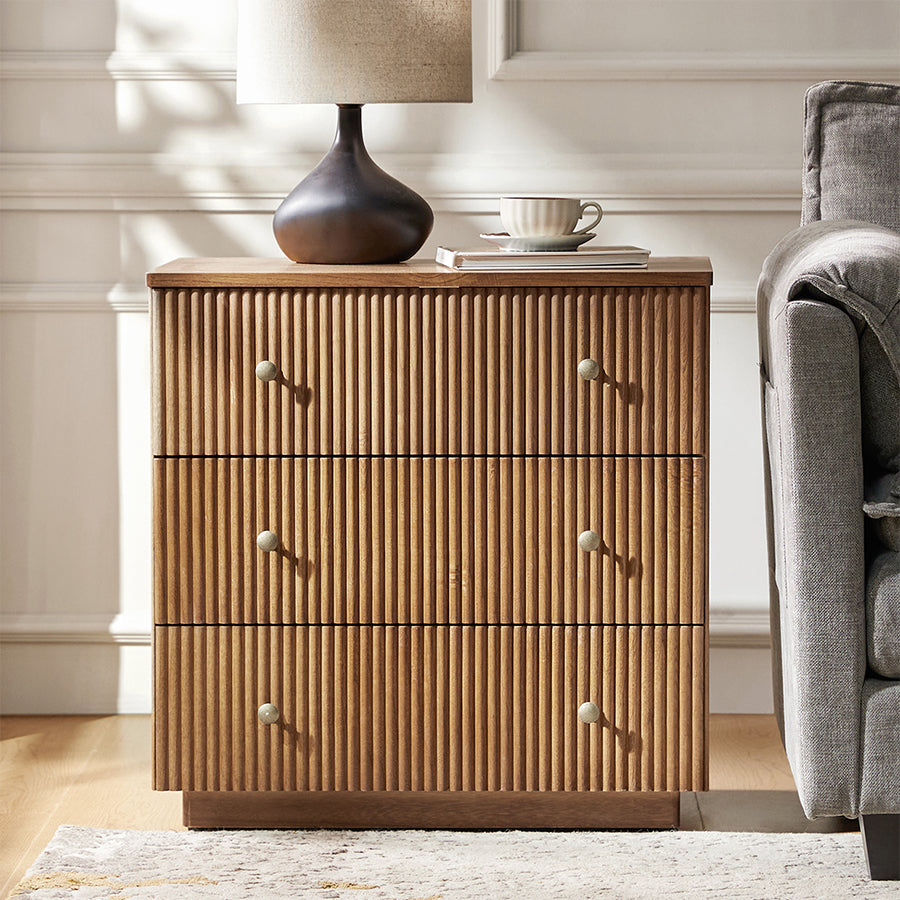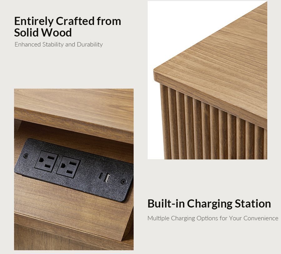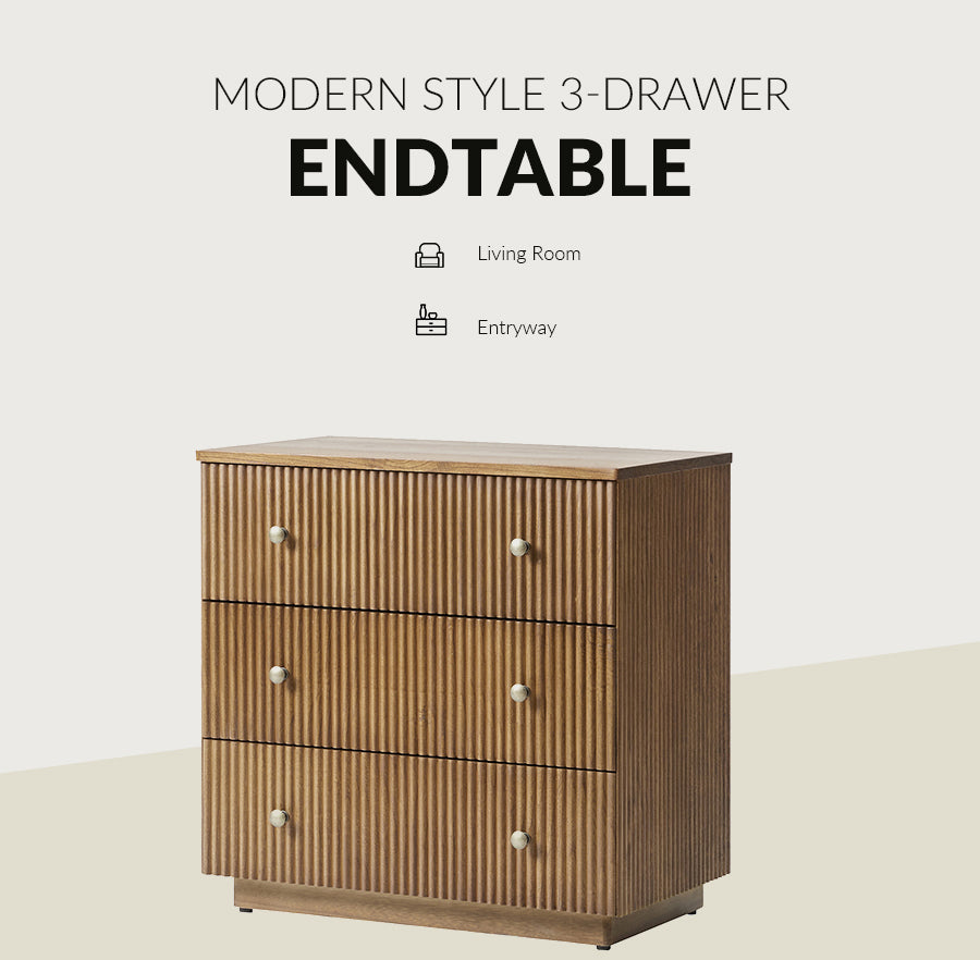 Elevate your living-room with this modern style 3-drawer end table, crafted from 100% solid wood for durability and natural elegance. The sleek, minimalist design features drawer fronts adorned with round fluting, adding a touch of texture to its streamlined silhouette. Three spacious drawers glide effortlessly, offering ample storage for your side essentials while maintaining a clutter-free space. An integrated charging station with built-in power outlets, Type-C, and USB ports, keeping your devices powered and within easy reach. Designed for convenience, this end table comes fully assembled, saving you time and effort. Perfectly balancing style and functionality, the end table complements different interior styles, from contemporary to minimalist. Its high-quality solid wood construction ensures stability for everyday use. Whether placed next to your or as an accent piece in your living area, this versatile end table enhances both your decor and daily living.