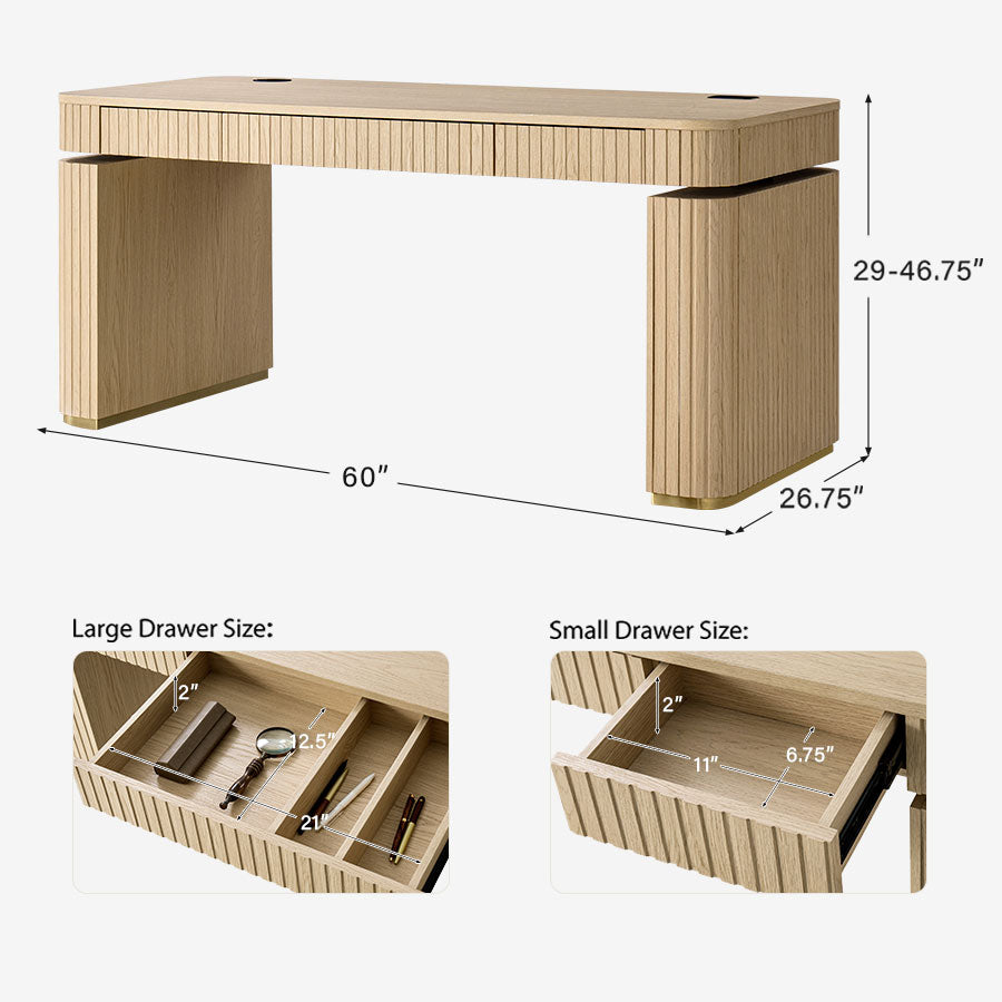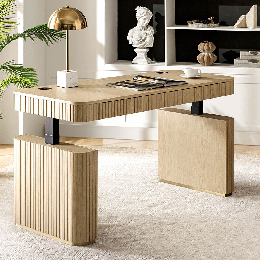 Upgrade your workspace with this modern electric height-adjustable desk, designed to bring contemporary style and ergonomic comfort to your home office. Clean lines and vertical fluted detailing give the desk a sophisticated, architectural look, while the subtle plated metal base adds a refined modern touch that complements a variety of interior styles.