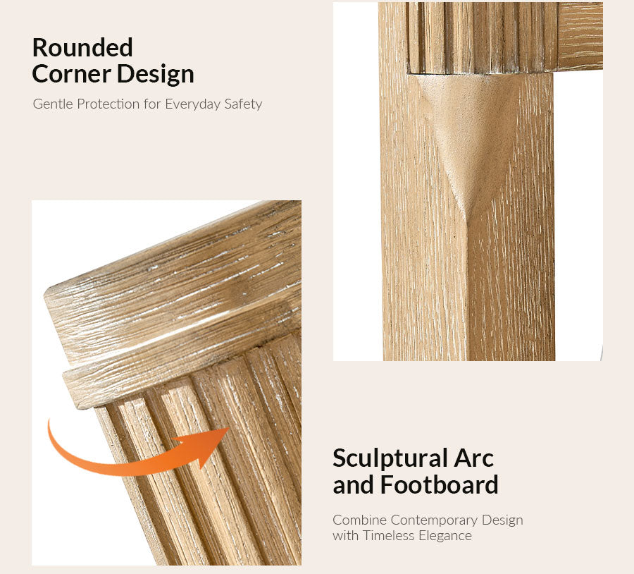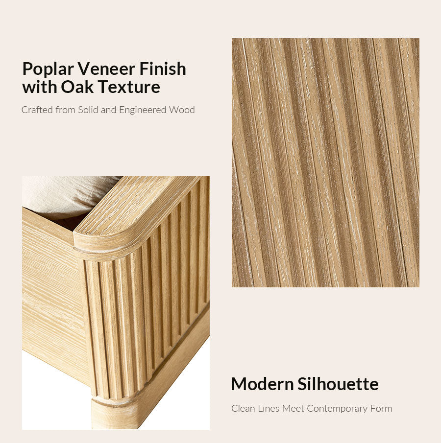 Crafted from solid poplar and engineered wood, the frame is finished in rich American oak grain, showing the natural beauty of real wood while offering durability that stands up to everyday living. The fluted vertical detailing adds a subtle depth and handcrafted charm—elegant without being fussy.