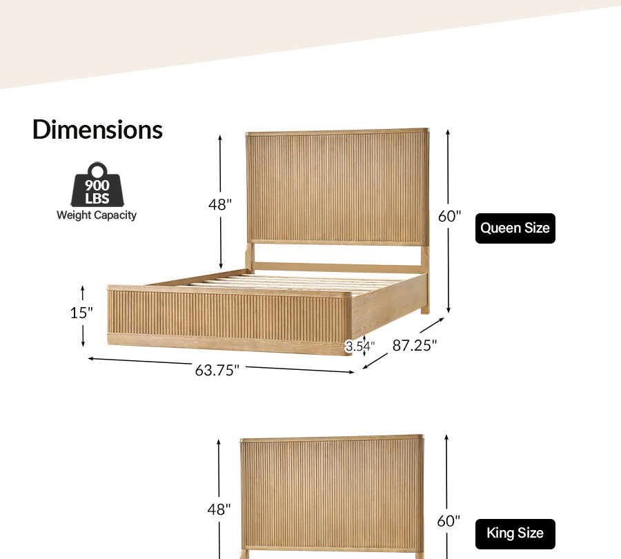 Built for everyday life: The sturdy wooden slats support your mattress directly, no box spring needed. That means fewer squeaks, no sagging, and years of reliable comfort. Available in King and Queen sizes, it fits both master bedrooms and guest spaces with ease.