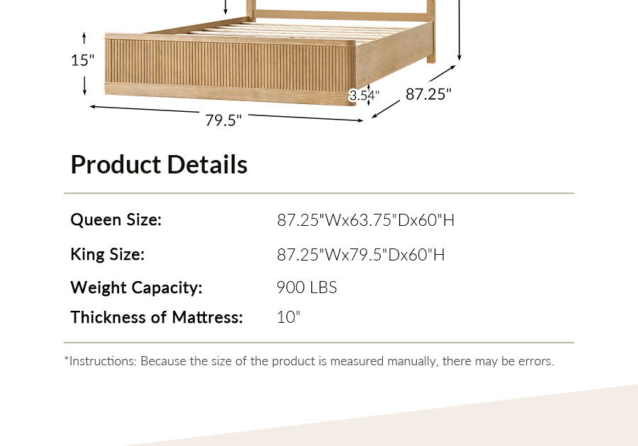 Under-Bed Clearance: 3.54'' King Bed Size: 87.25''Wx79.5''Dx60''H Queen Bed Size: 87.25''Wx63.75''Dx60''H Instructions:Because the size of the product is measured manually, there may be errors.