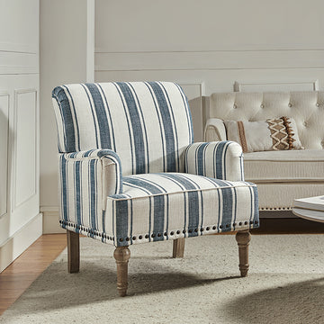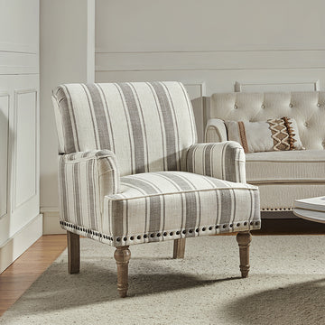 Farmhouse style and classic design combine in this inviting armchair. It features a solid and manufactured wood frame, wrapped in 100% polyester upholstery with a stripe design, elegantly carved front legs, and simple back legs that offer a visual variation. The foam-filled back provides extra support, while the nail head trim adds a dose of vintage design to it. It is suitable for most of your daily scenarios such as study room, bedroom, and living room. Whether you are enjoying quality family time or entertaining guests, this armchair will extend an open invitation for everyone to relax.