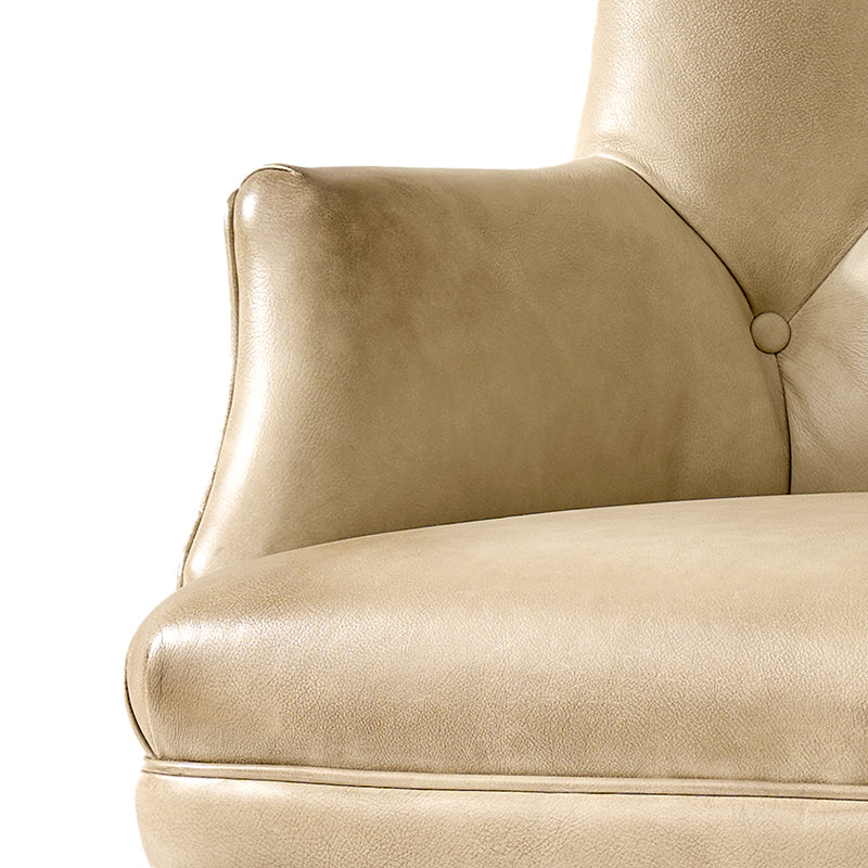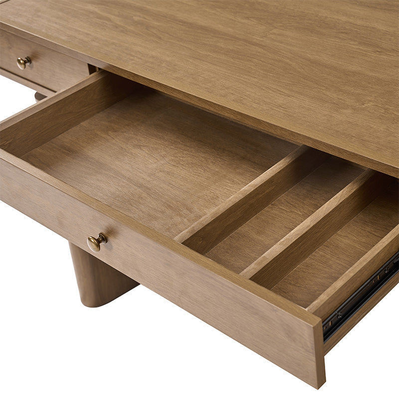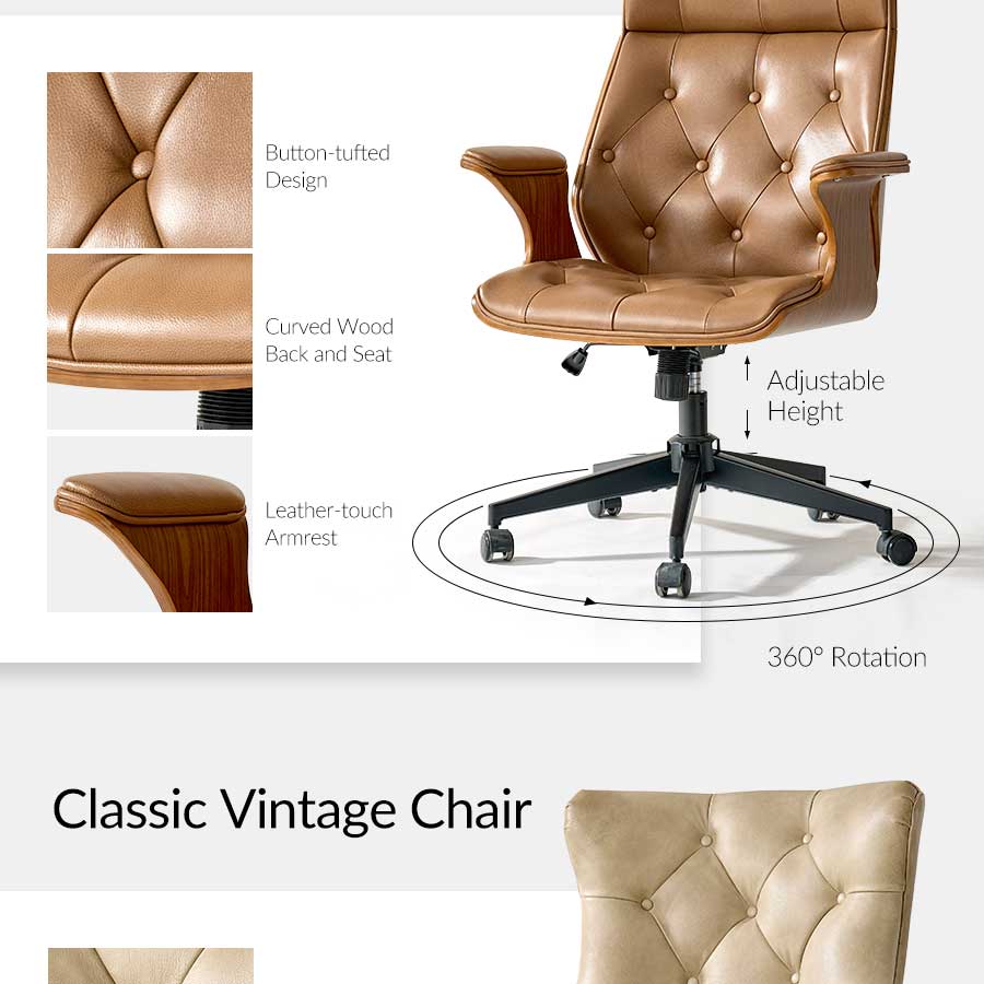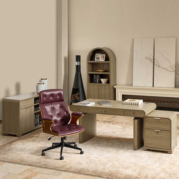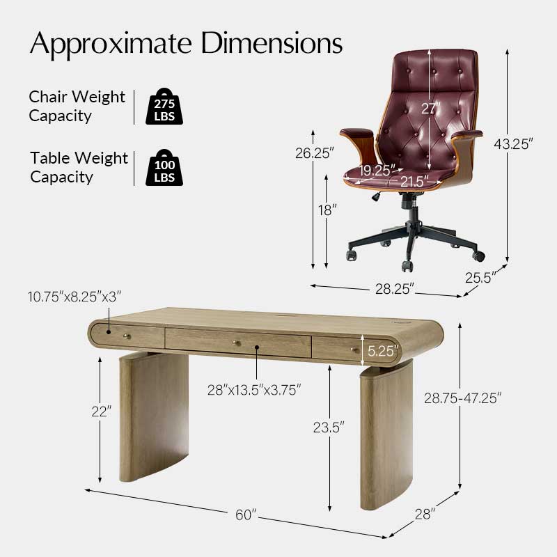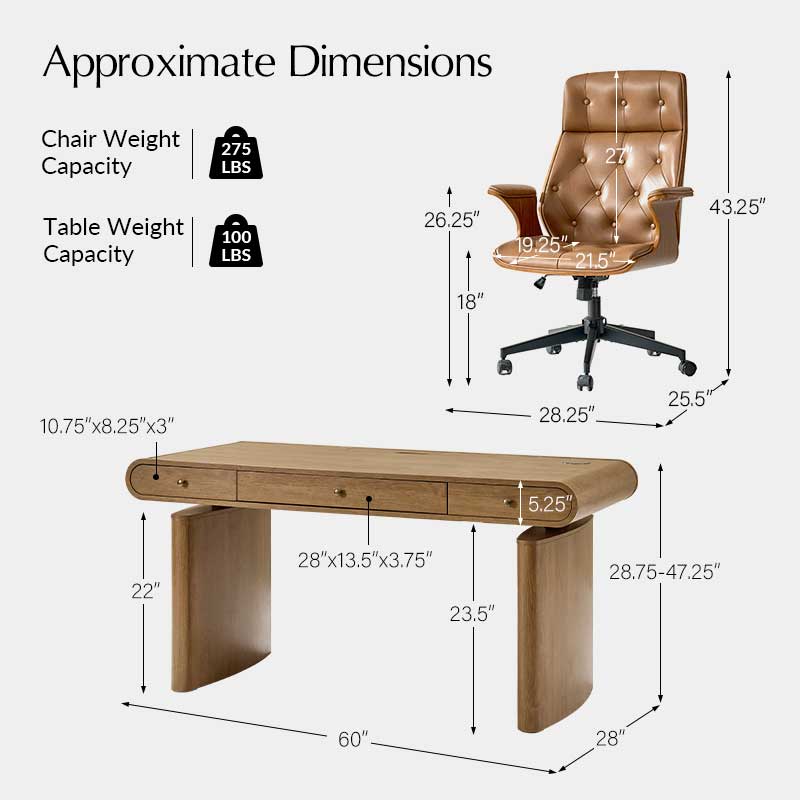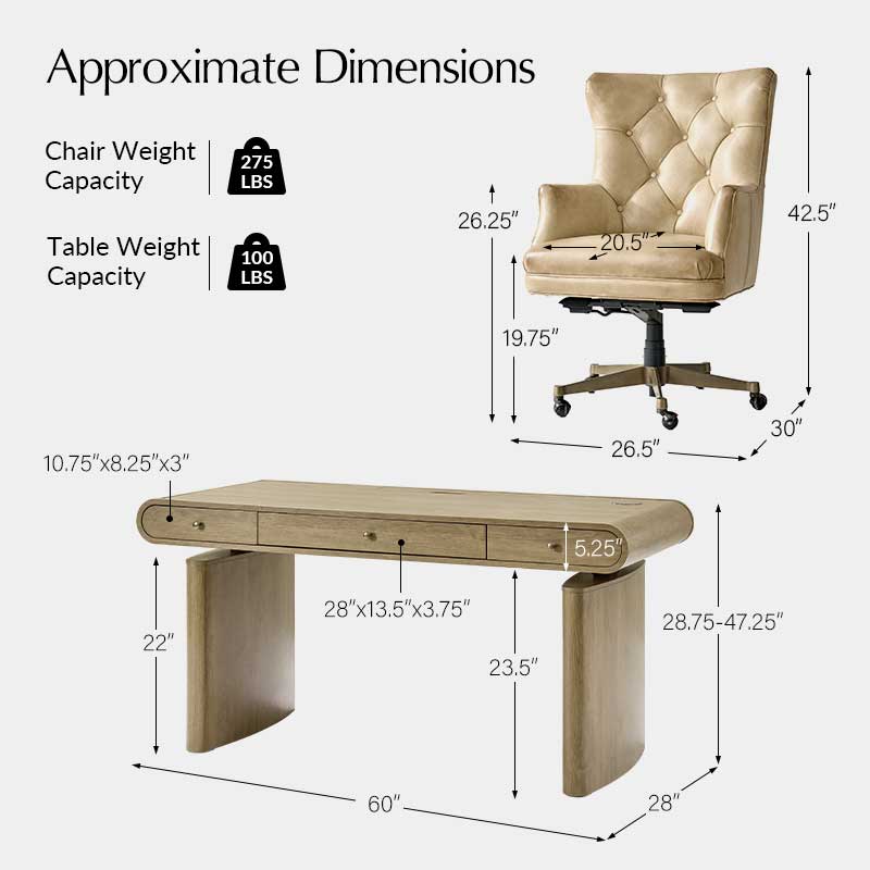 Three smooth-gliding drawers, including a partitioned center drawer, provide organized storage for office essentials, documents, and supplies. The set also includes a vintage-inspired office chair upholstered in high-quality leather with classic button-tufted detailing, ensuring ergonomic comfort and timeless style.
