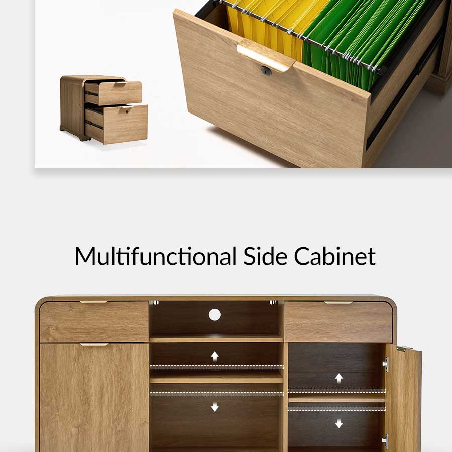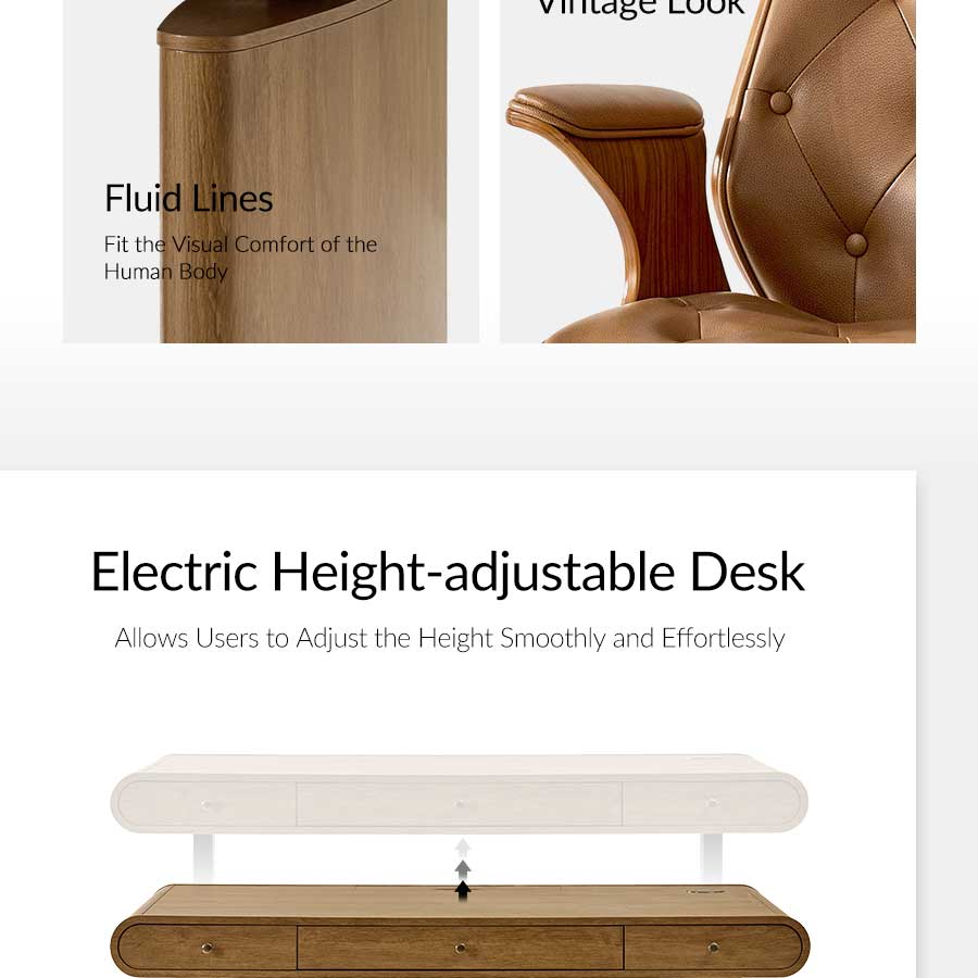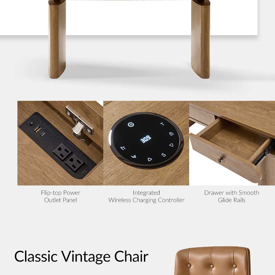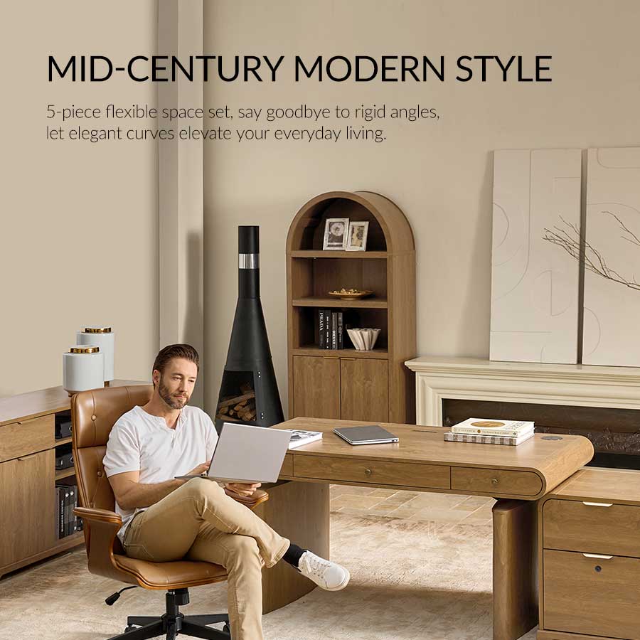 Elevate your home office with this 5-piece farmhouse office set, thoughtfully designed to blend mid-century modern style with practical functionality. The centerpiece, an electric height-adjustable desk, features a gracefully curved profile that adds elegance to your workspace. A built-in wireless charging station and flip-top compartment with integrated outlets and cable management keep your desktop clutter-free and organized.