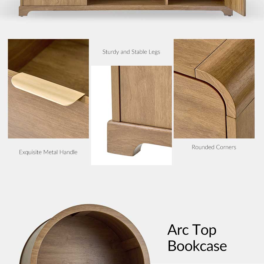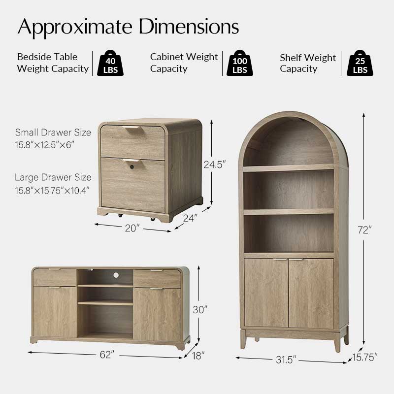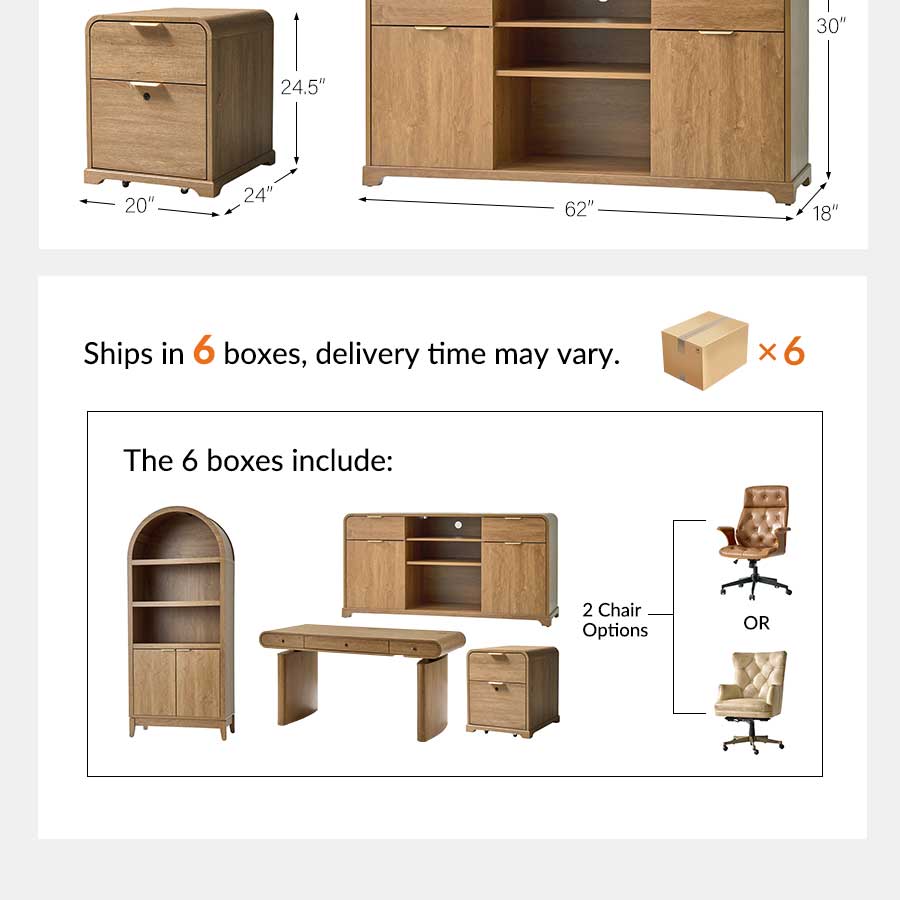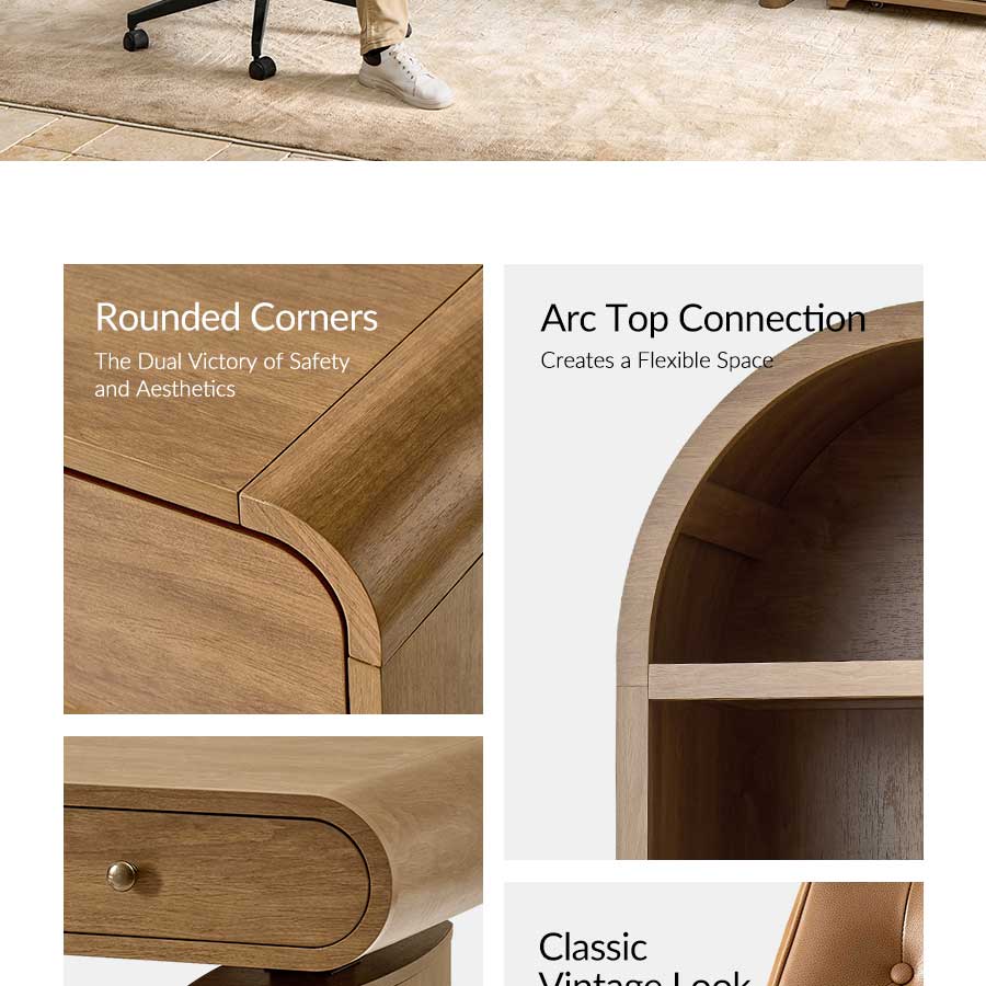 Elevate your home office with this 5-piece farmhouse office set, thoughtfully designed to blend mid-century modern style with practical functionality. The centerpiece, an electric height-adjustable desk, features a gracefully curved profile that adds elegance to your workspace. A built-in wireless charging station and flip-top compartment with integrated outlets and cable management keep your desktop clutter-free and organized.