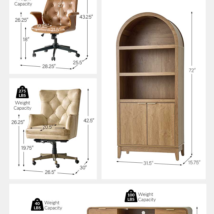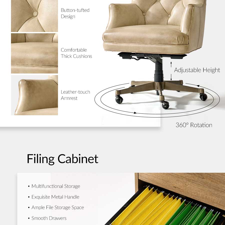Additional pieces—a matching bookcase, cabinet, and file cabinet—offer ample storage for books, files, and decorative items, completing a cohesive and inviting workspace. Designed to balance functionality, comfort, and aesthetic appeal, this set transforms any room into a stylish, productive home office environment.