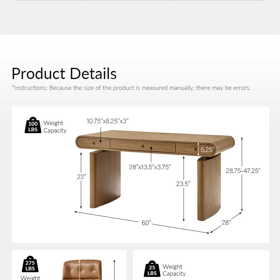 Size: 60″ W × 28″ D × 28.75″–47.25″ H (electric height-adjustable) Weight: 179.85 lbs