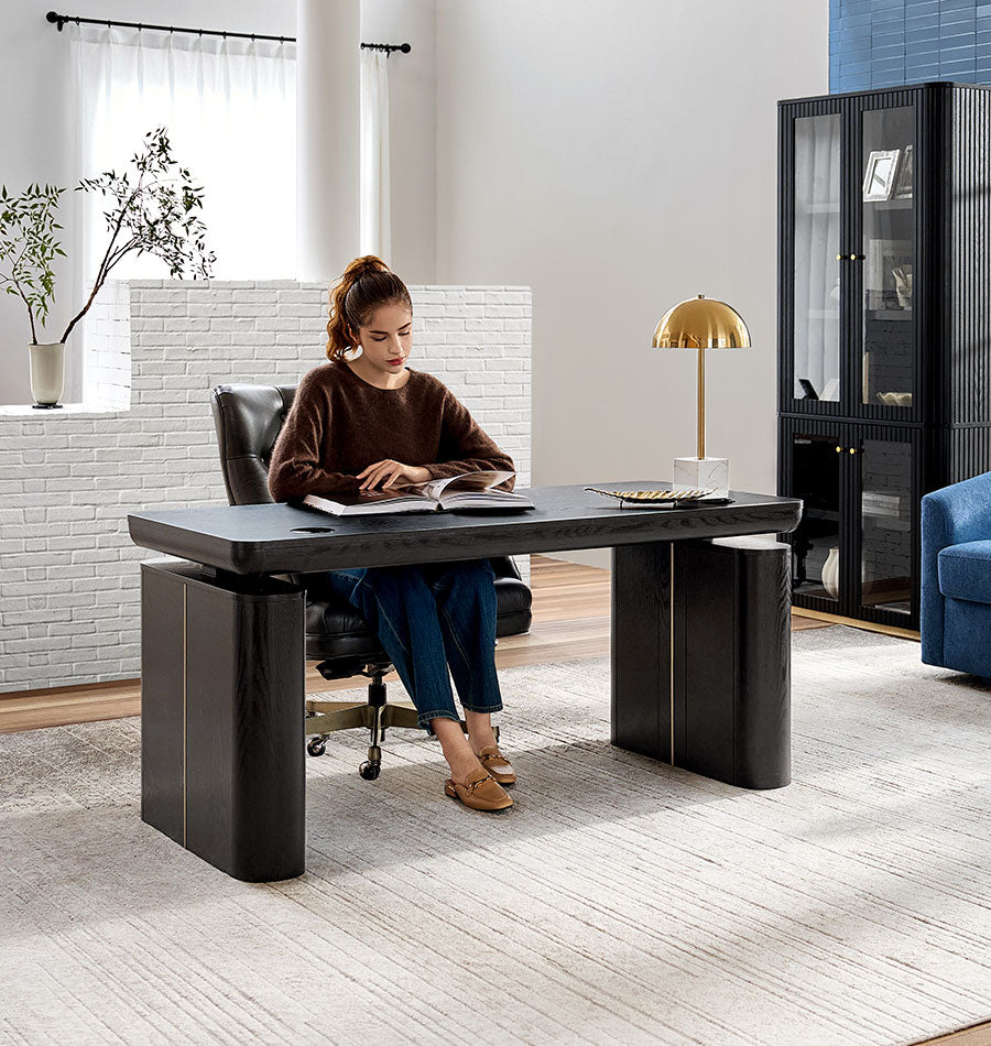 Subtle design details elevate its modern character. A slim metal inlay along each side panel introduces a precise architectural accent, adding depth and contrast while maintaining the desk’s sleek minimalist profile.
