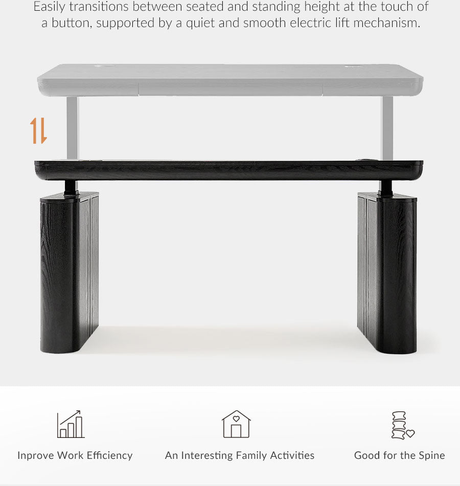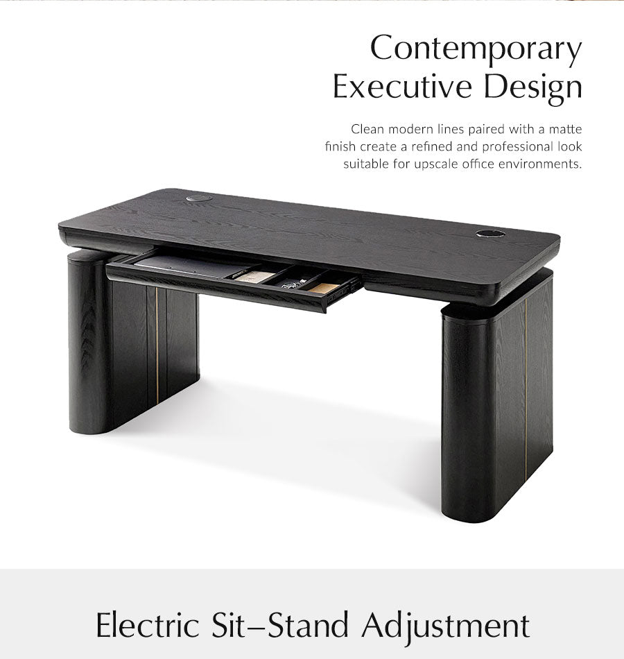Upgrade your workspace with this modern electric adjustable standing desk, designed to combine minimalist architecture with everyday ergonomic performance. Featuring a matte black tabletop and sculpted pedestal-style legs, the desk delivers a clean, monolithic silhouette that adds a refined executive presence to any office or home workspace.