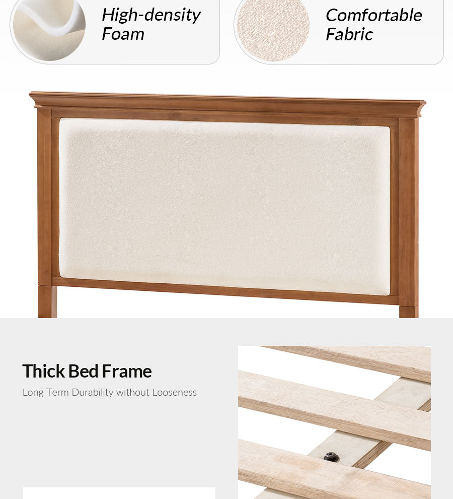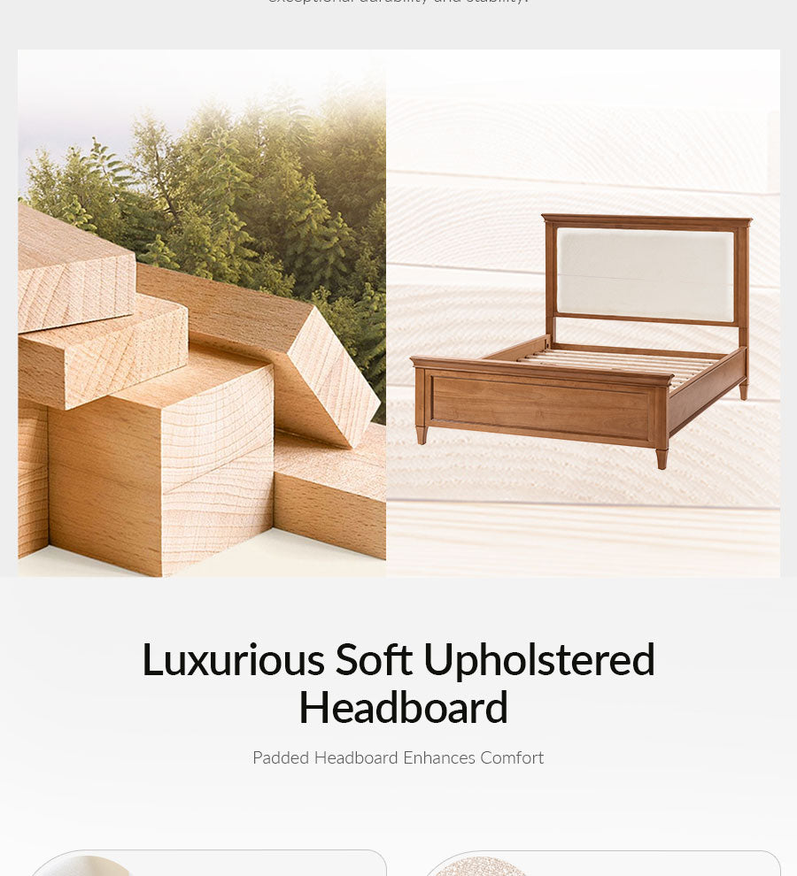 Comfort Meets Contrast: The upholstered headboard, framed by solid wood in a complementary contrast finish, adds inviting comfort while subtly elevating the overall design with a modern touch.