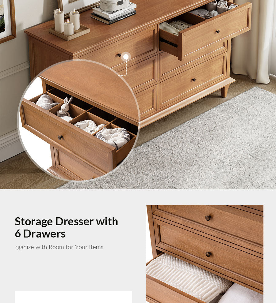 Thoughtful Storage Solutions: The six-drawer dresser offers generous, well-proportioned storage, while the nightstands provide practical layouts that keep bedside essentials organized without sacrificing visual balance.