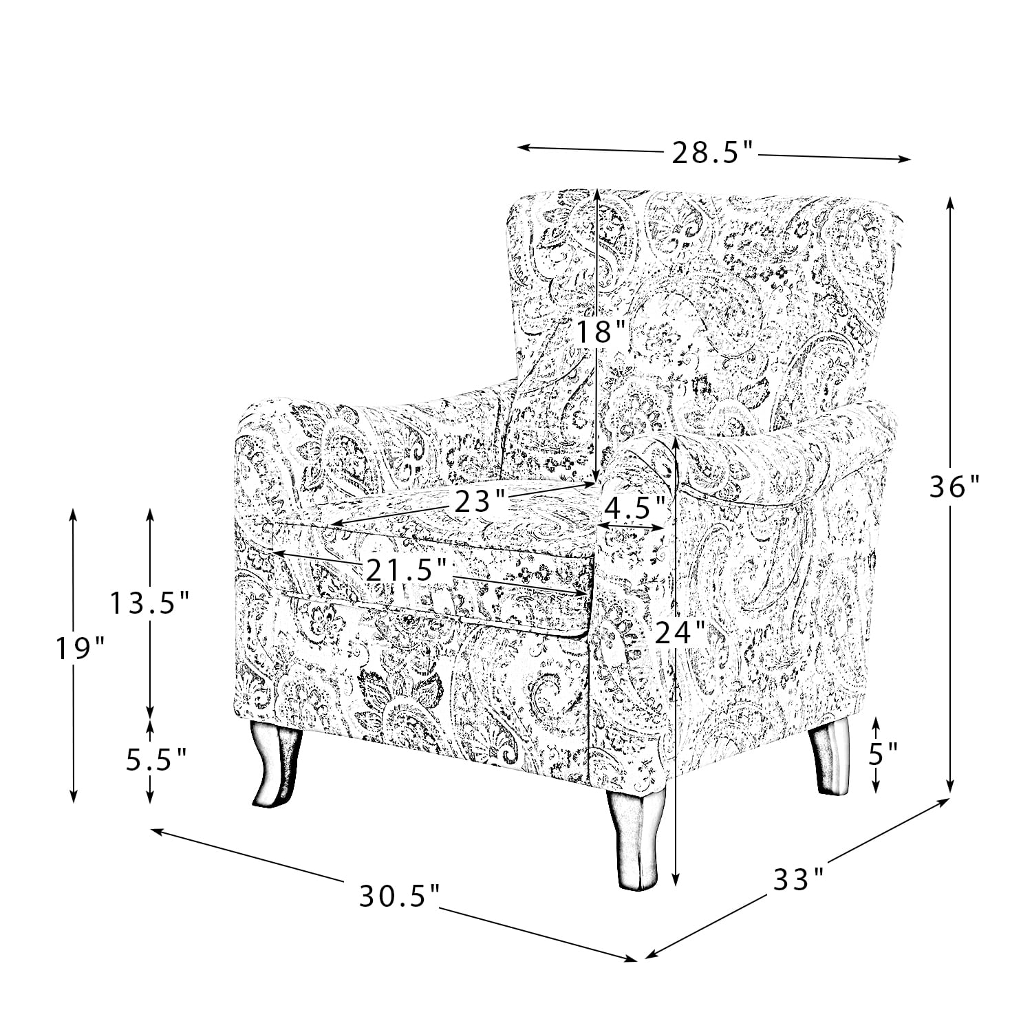 Item Size:30.5”W x 33”D x 36”H Seat Size:21.5”W x 23”D x 19”H Item Weight:47.3 lb. Weight Capacity:250 lb. Front Leg Height:5.5”H Back Leg Height:5”H Back Height to Seat:18”H Arm to Floor Height:24” H