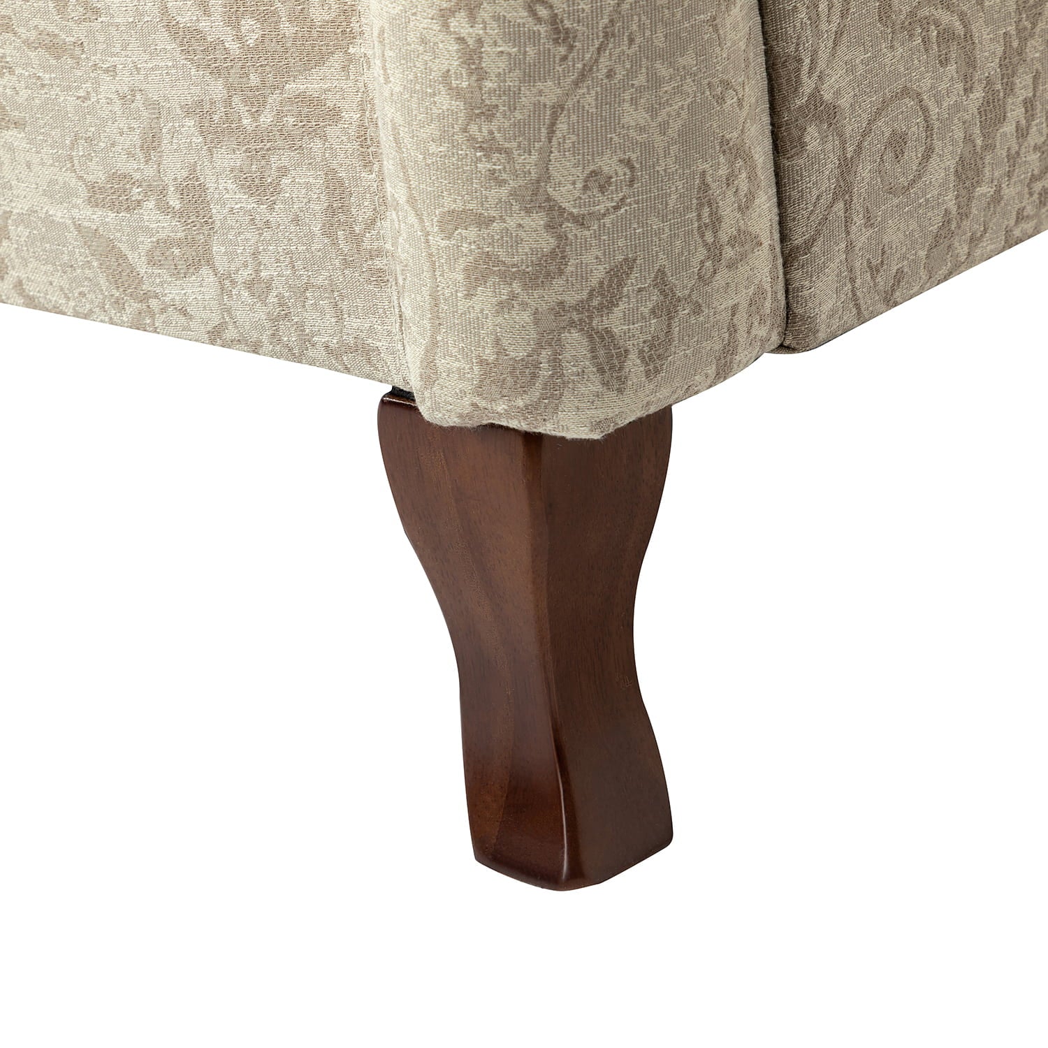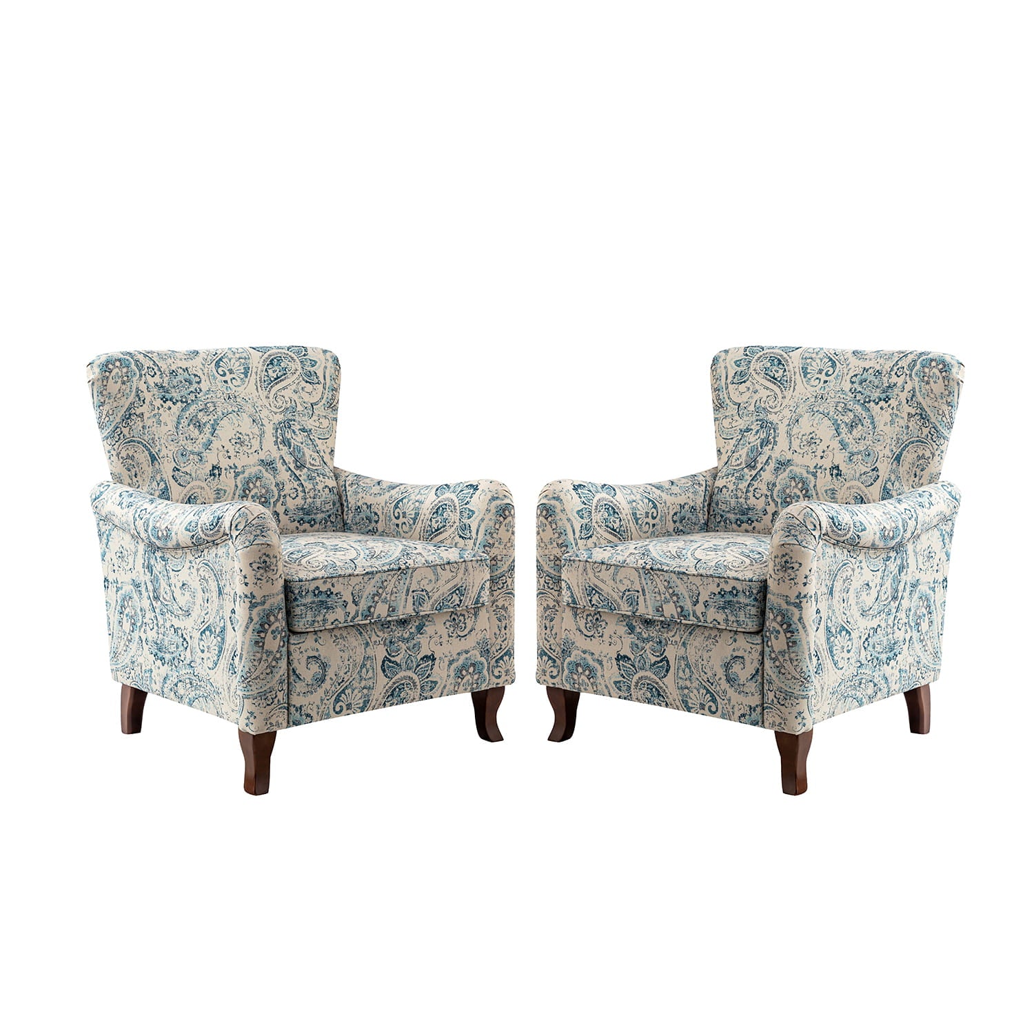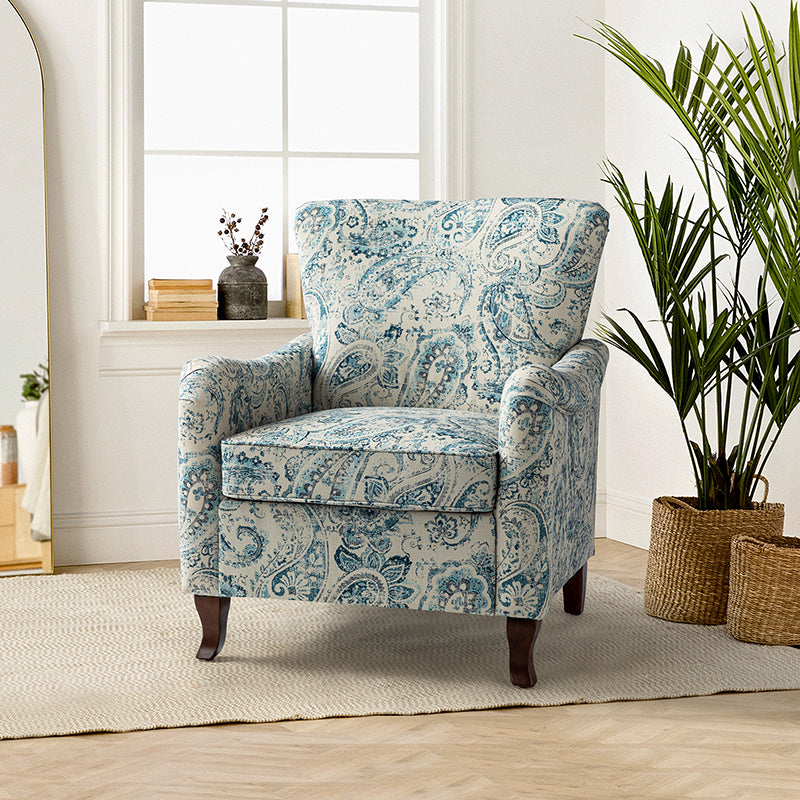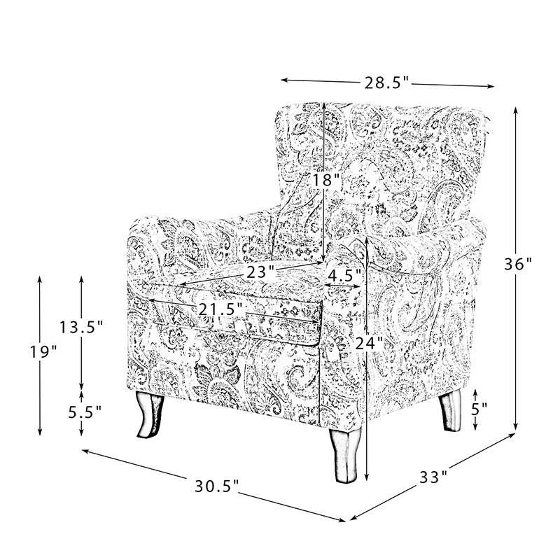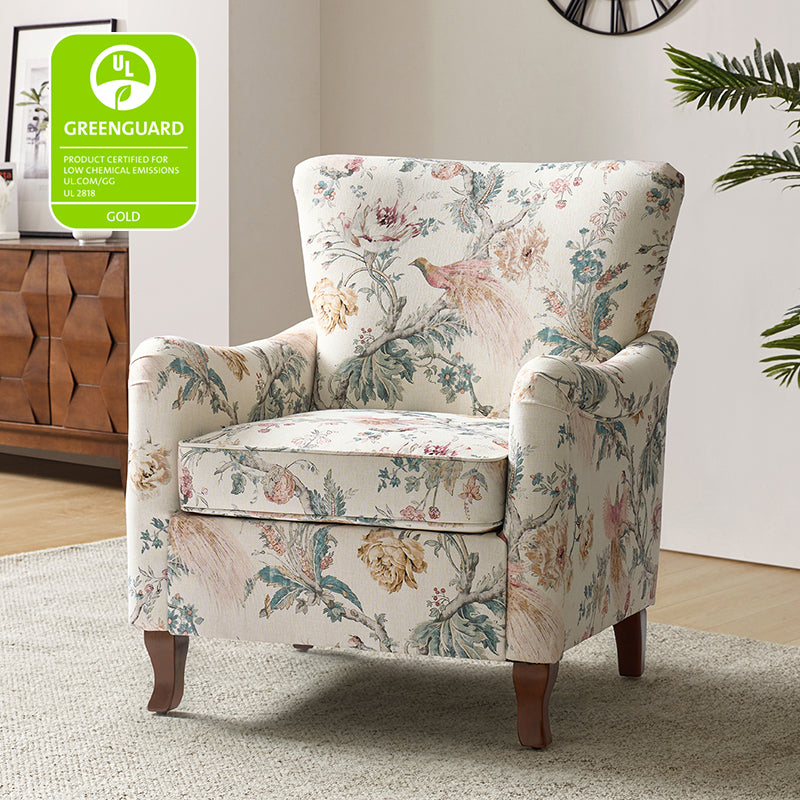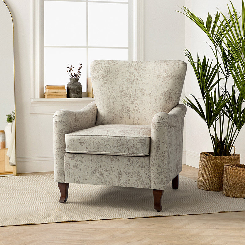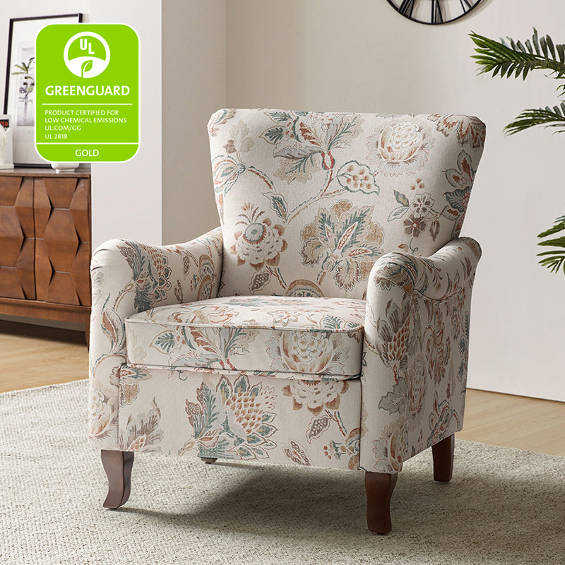 This farmhouse style armchair creates an essential spot to sit back and enjoy a good book or catch up on your favorite show. The armchair with is constructed with a solid and manufactured wood frame, and the seat is filled with thick foam and sinuous springs to ensure maximum comfort and support. It features a wide wingback and a unique armrest design that provides support for the arms and shoulders, allowing you to relax and unwind. The fabric upholstery on the chair body is adorned with a floral pattern and the graceful contours of the armrests, adding a touch of sophistication to your living space. As the fushion of traditional, classic, transitional elements, this armchair is a perfect way to add a much-needed extra resting spot to your seating arrangement while also helping to emphasize your living room style, making it a great finishing touch.