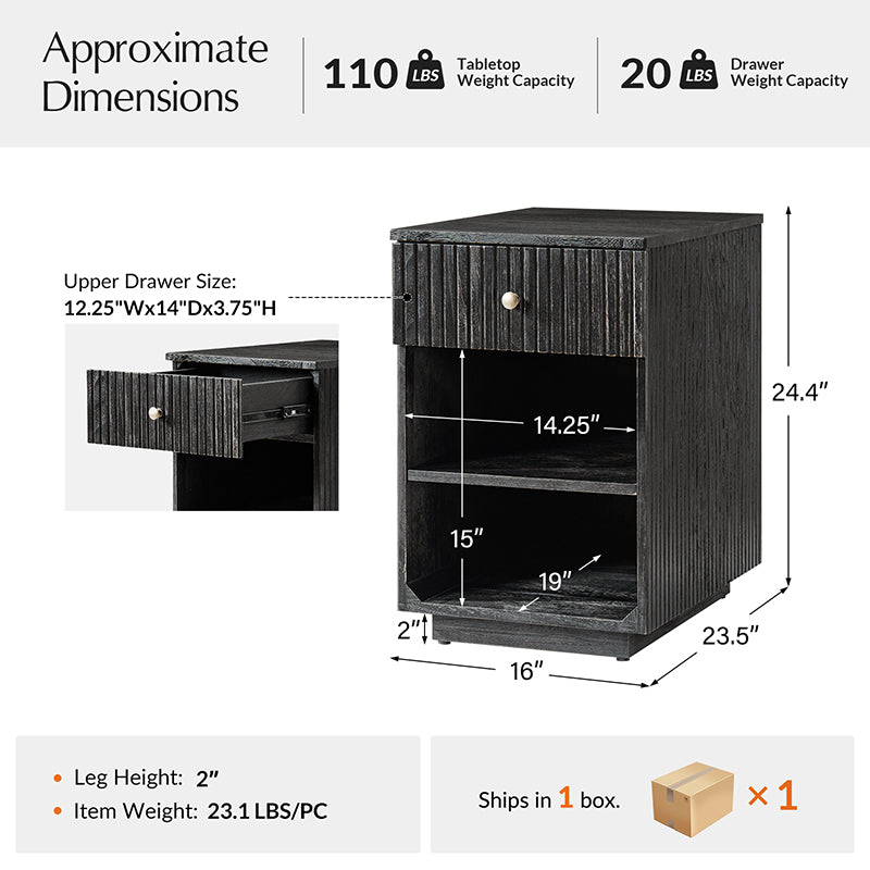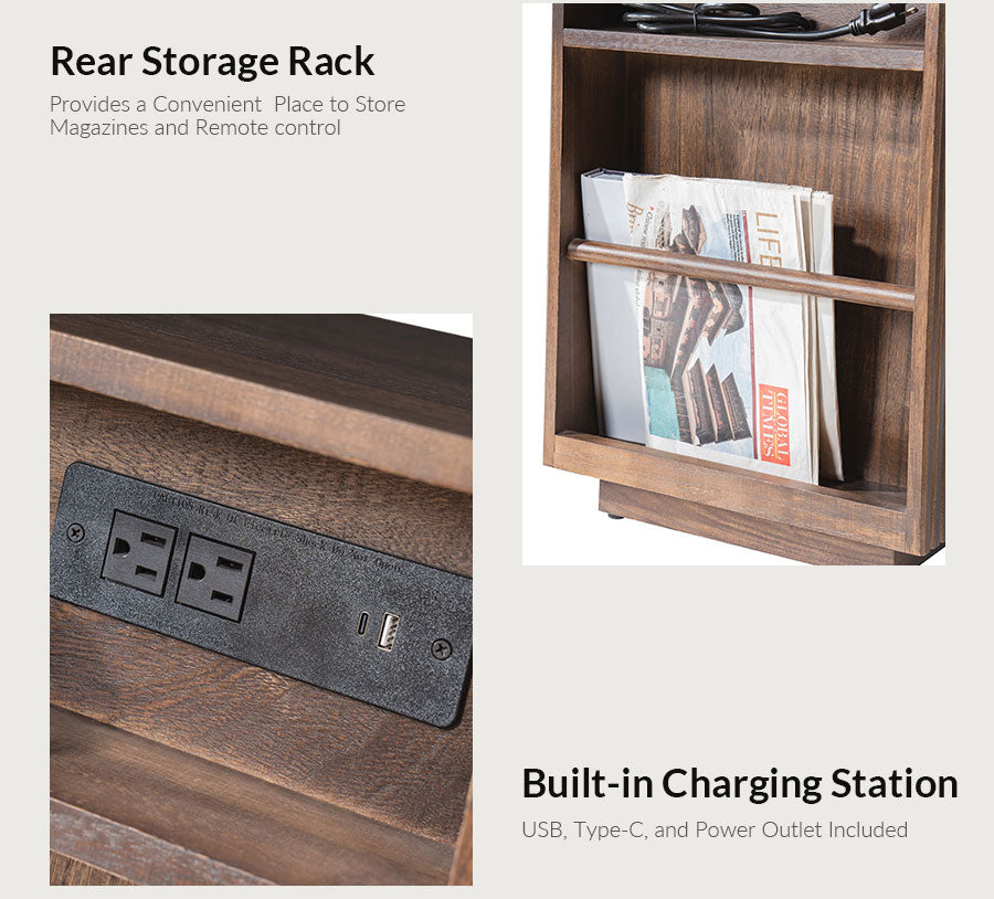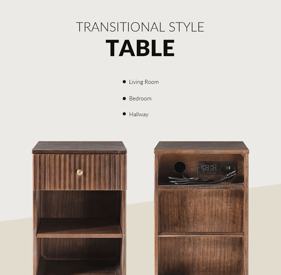 -Product Including: One end tables, fully assembled. -Paulownia Wood Construction: Built from premium solid poplar wood, this end table ensures lasting durability and stability. The natural wood grain offers a rich, organic texture that enhances the charm of farmhouse, transitional, or rustic interiors. -Convenient Built-in Power Outlet and USB Ports: Equipped with an integrated power outlet and USB ports, the end table allows you to easily charge phones, tablets, or other electronics for modern living rooms, bedrooms, or home offices. -Unique Fluted Design: Featuring elegant vertical reedings, the fluted detailing brings depth and sophistication to the design, adding a refined architectural element that catches the eye while blending with various decor styles. -No Assembly Required: Delivered fully assembled for your convenience, this end table saves you time and effort. Simply unbox and place it wherever you need extra surface space and smart storage. -Ample Interior Storage: Designed with function in mind, the spacious internal compartment provides ample room for storing books, remotes, or personal items, helping you maintain a clean and organized living space.