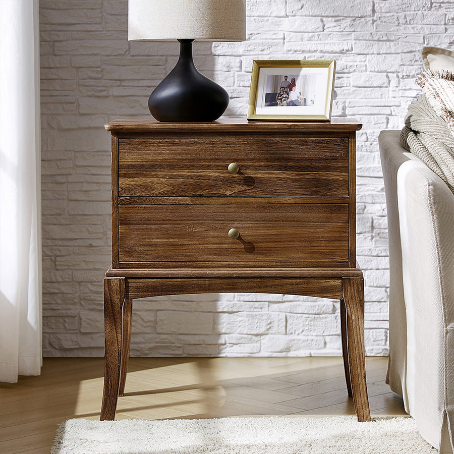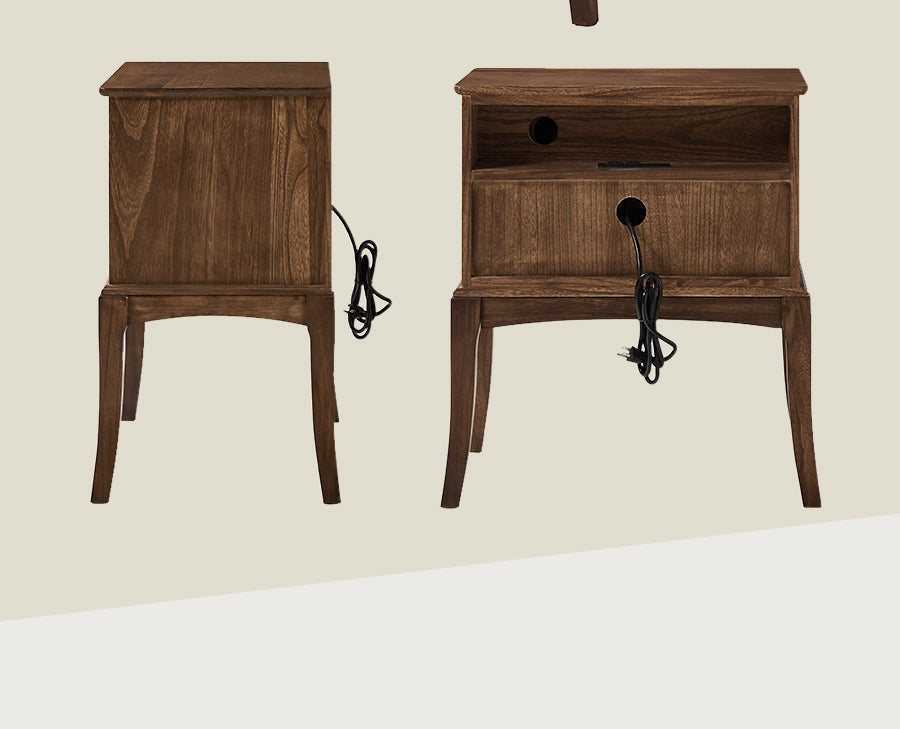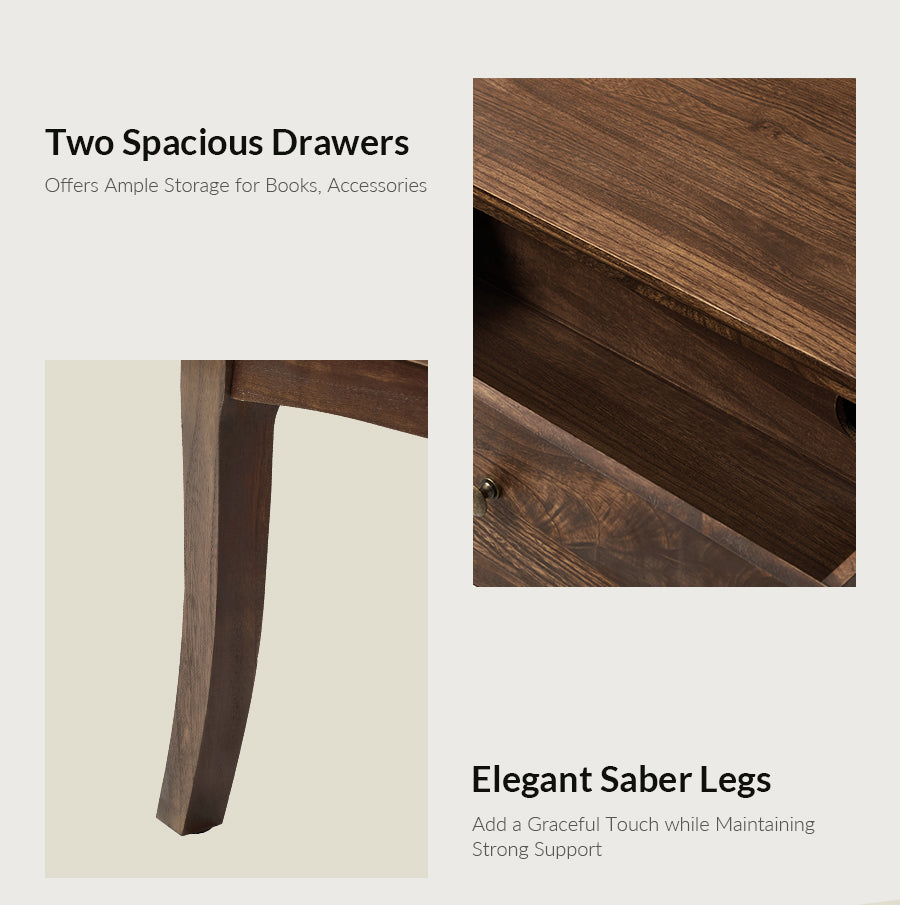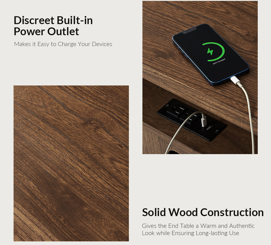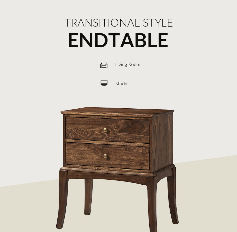 This transitional end table is crafted from solid Paulownia wood, offering durability and a timeless aesthetic. Its elegant design features a subtle saber leg base, adding a touch of sophistication and stability to the piece. The end table is equipped with two spacious drawers for convenient storage, ensuring that essentials are always within reach. A hidden outlet located behind the top drawer provides a discreet and practical solution for charging devices without cluttering the surface. The natural wood grain and sleek lines create a versatile look that complements both modern and traditional interiors, making this end table a suitable addition to your livingroom or livingroom space.
