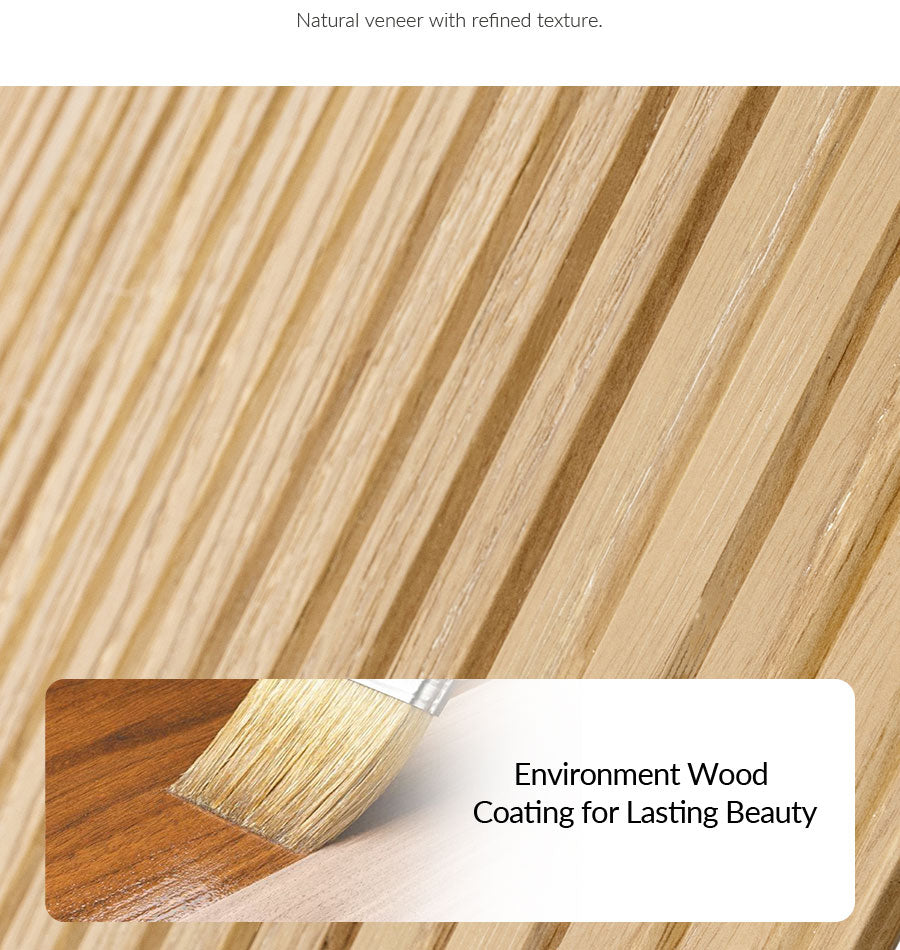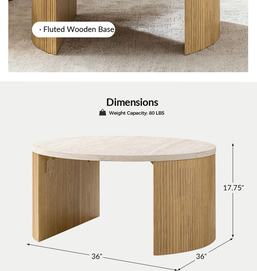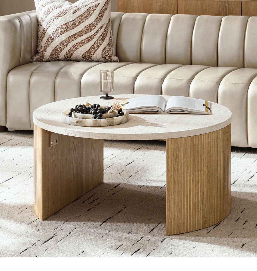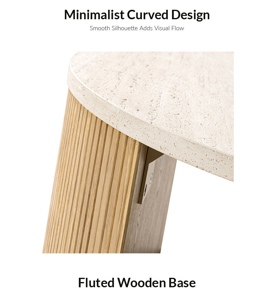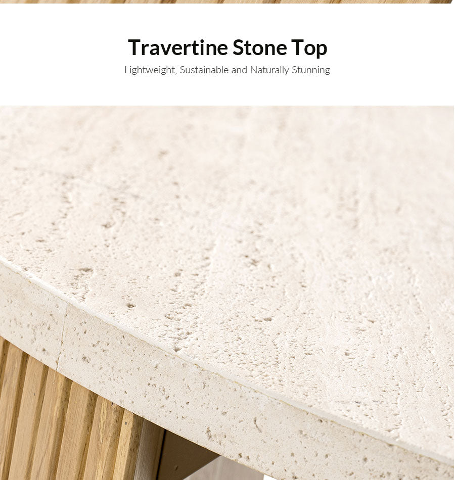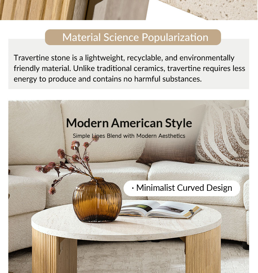 This coffee table showcases a refined modern American aesthetic, combining minimalist curves with natural textures for a timeless look. The fluted wooden legs feature a smooth natural veneer and premium eco-friendly paint, creating a warm yet sophisticated appearance. The tabletop is crafted from high-quality travertine stone — a lightweight, recyclable, and environmentally friendly material. Unlike traditional ceramics, travertine requires less energy to produce and contains no harmful substances, making it a sustainable choice for modern living. Elegant, functional, and eco-conscious, this table seamlessly blends natural beauty with responsible craftsmanship.