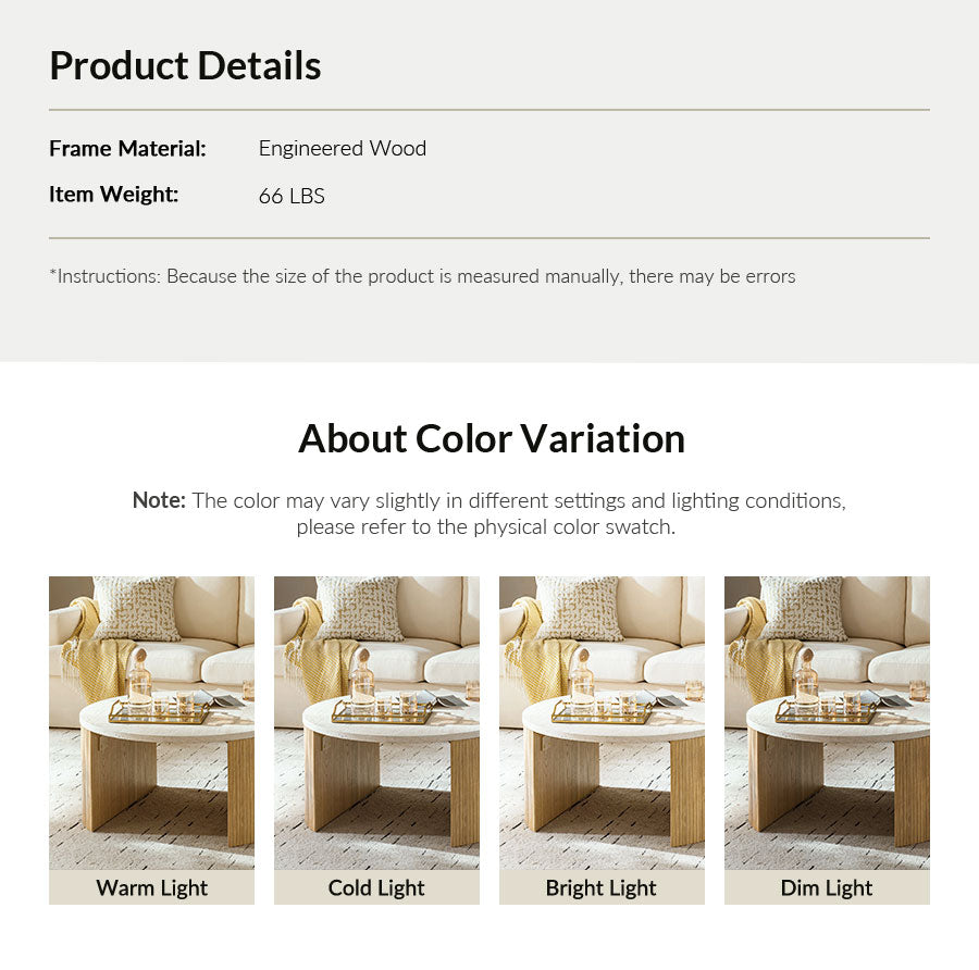 Product Details Items Included: One Coffee Table Assembly Required: Yes Weights & Dimensions Item Size: 36"x36"x17.75" Item Weight: 66LBS Frame Material: Engineered Wood Instructions: Because the size of the product is measured manually, there may be errors.