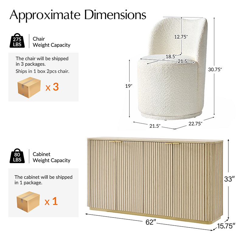 Table Weight: 138 lbs Chair Weight: 33 lbs Sideboard Weight: 126 lbs Note: Due to manual measurement, some product dimensions may vary.