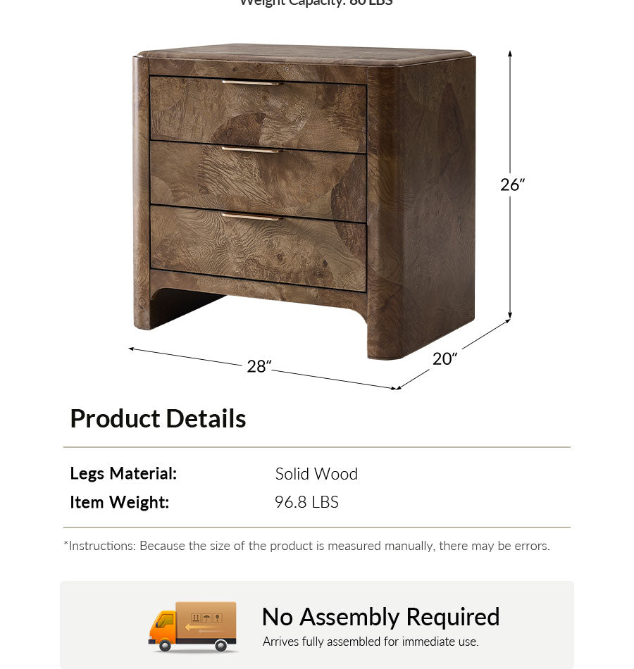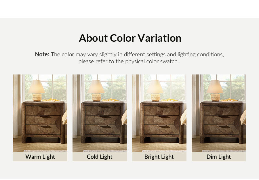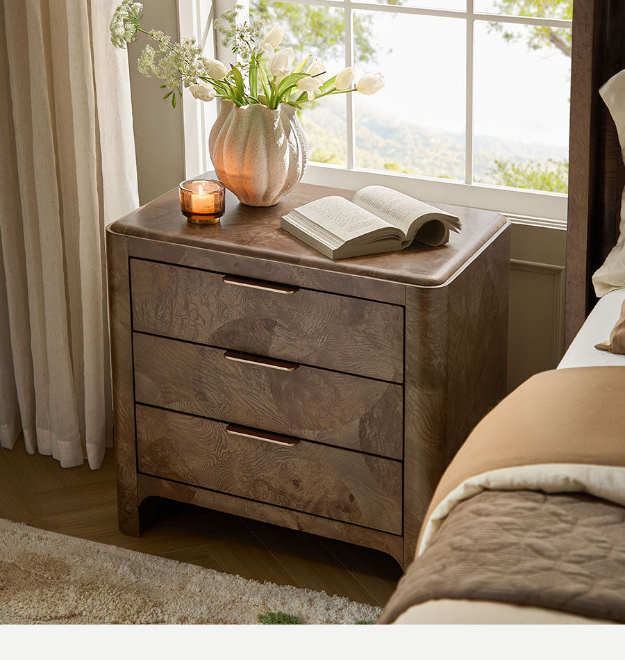 Crafted with a carefully selected blend of olive, poplar, and ash burl veneers, each piece showcases distinctive natural wood grain—meaning no two nightstands are exactly alike. The solid wood frame provides long-lasting durability and stability, while the smooth curved edges add a contemporary yet inviting feel.