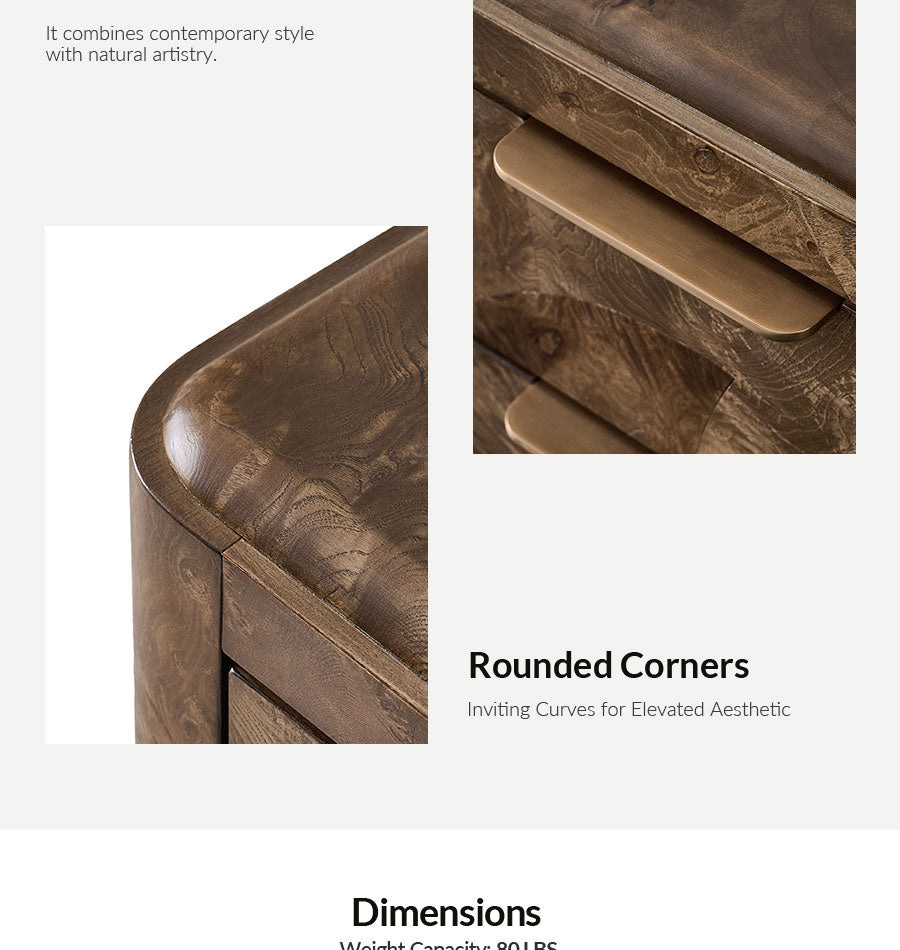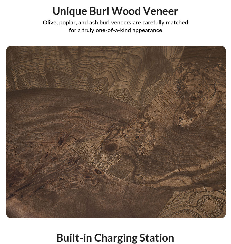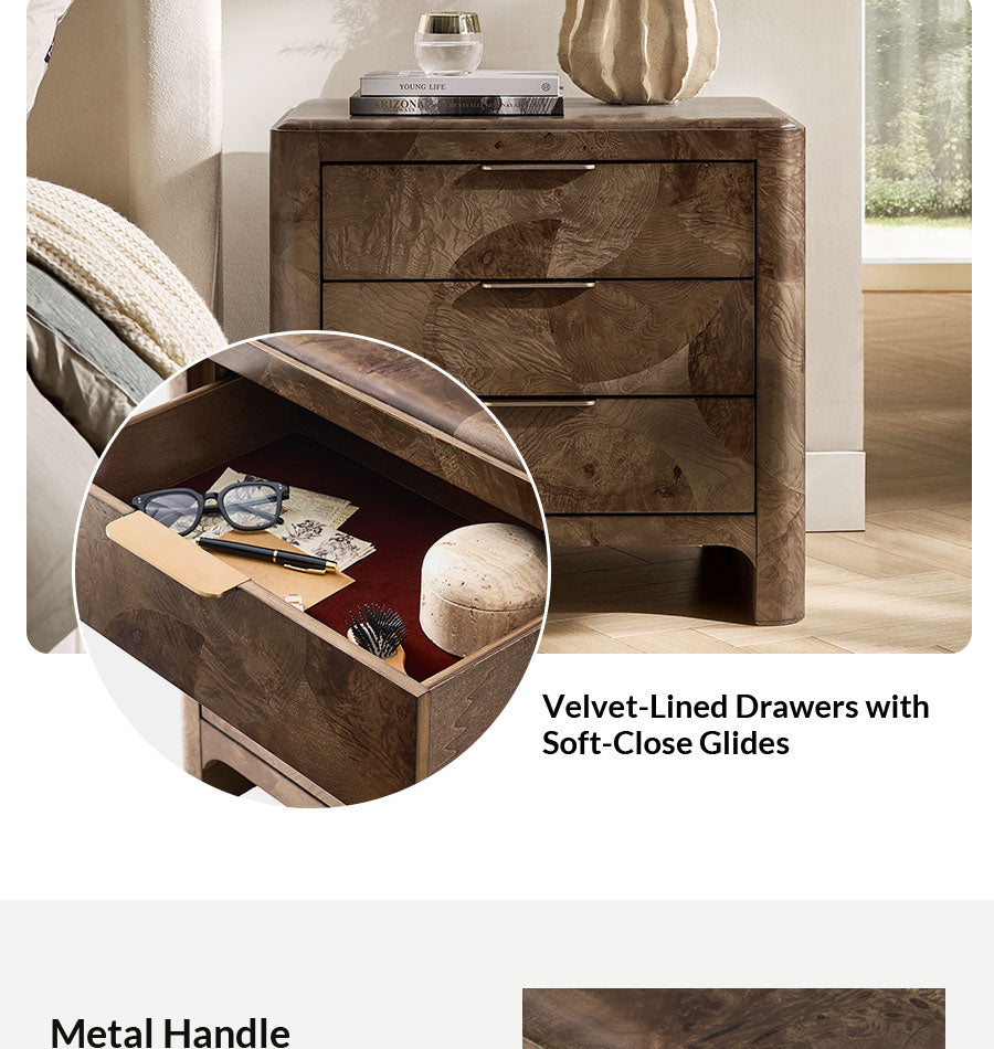 - Modern Sculptural Design Rounded edges and sleek metal handles create a clean, contemporary look that complements modern and transitional bedrooms. - Unique Burl Wood Veneer Olive, poplar, and ash burl veneers are expertly matched for a truly one-of-a-kind wood grain pattern. - Built-In Charging Station Rear-mounted power outlet with USB and Type-C ports keeps devices organized and conveniently powered. - Velvet-Lined, Soft-Close Drawers Protect delicate items while enjoying smooth, quiet drawer operation. - Fully Assembled & Ready to Use Solid wood construction arrives fully assembled—no tools or setup required.