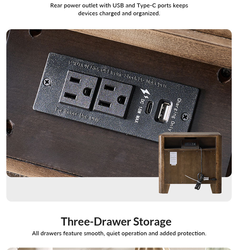 Function meets convenience with a built-in rear charging station, featuring standard power outlets along with USB and Type-C ports to keep your phone, tablet, or bedside lamp powered and within reach.